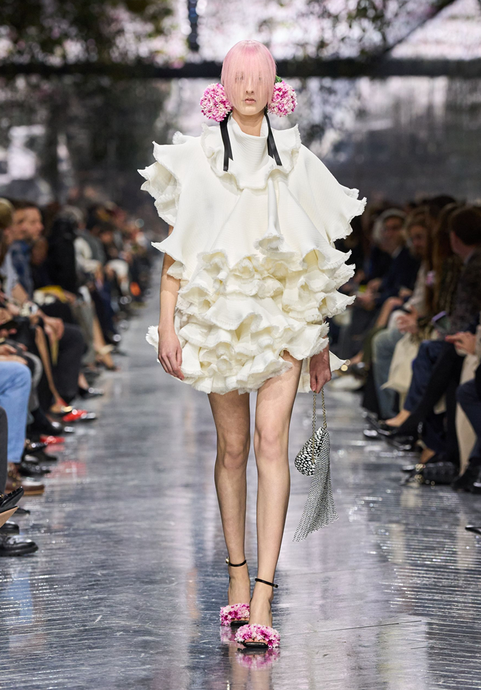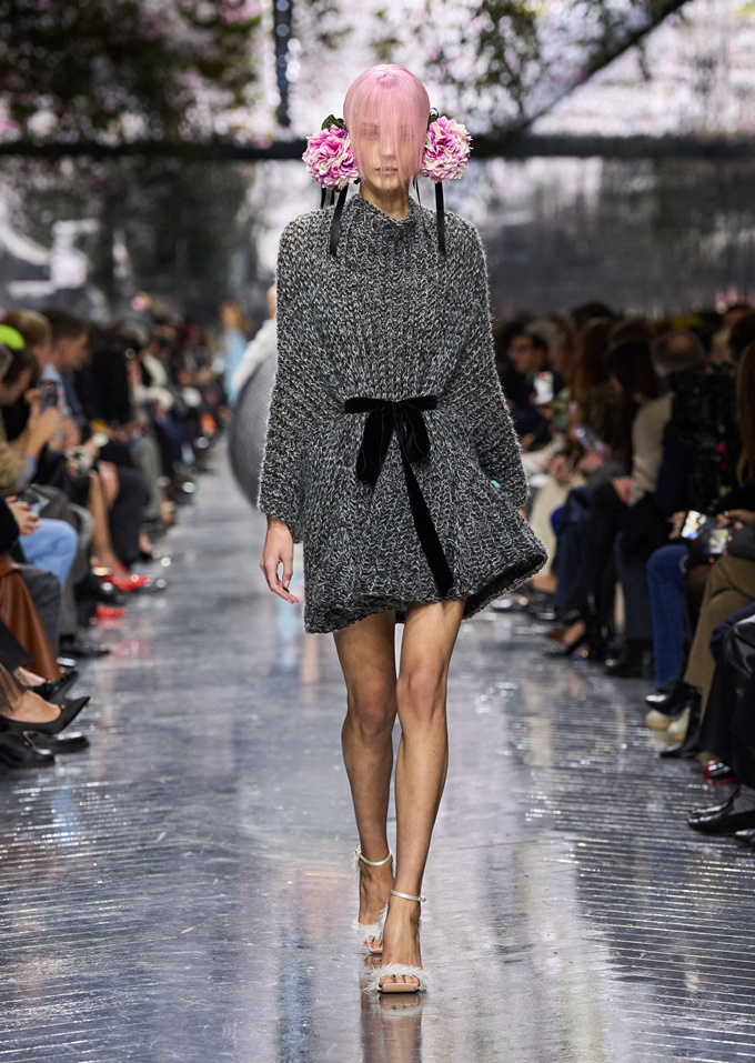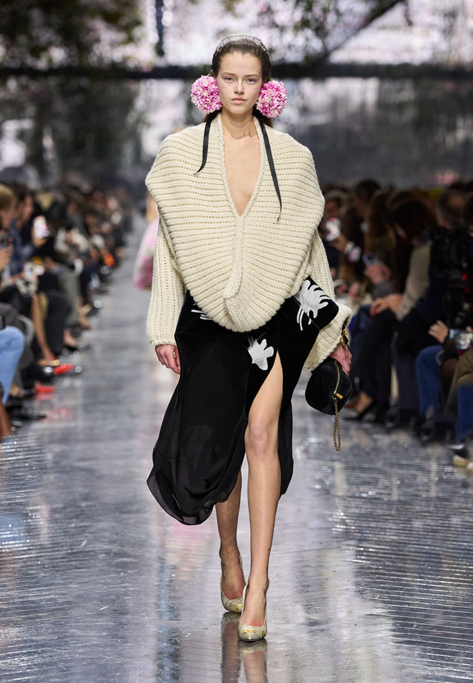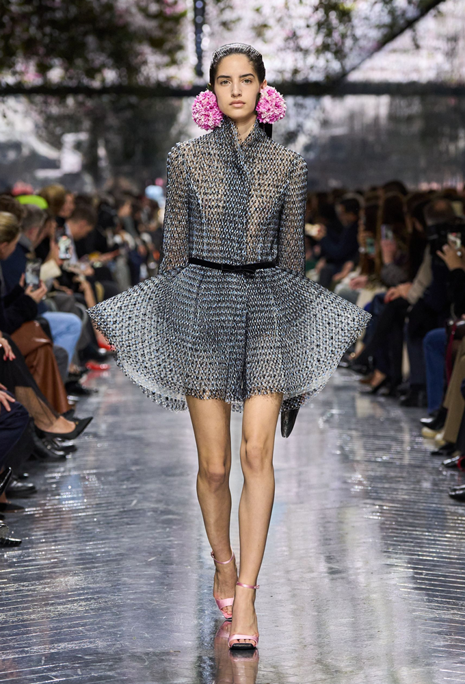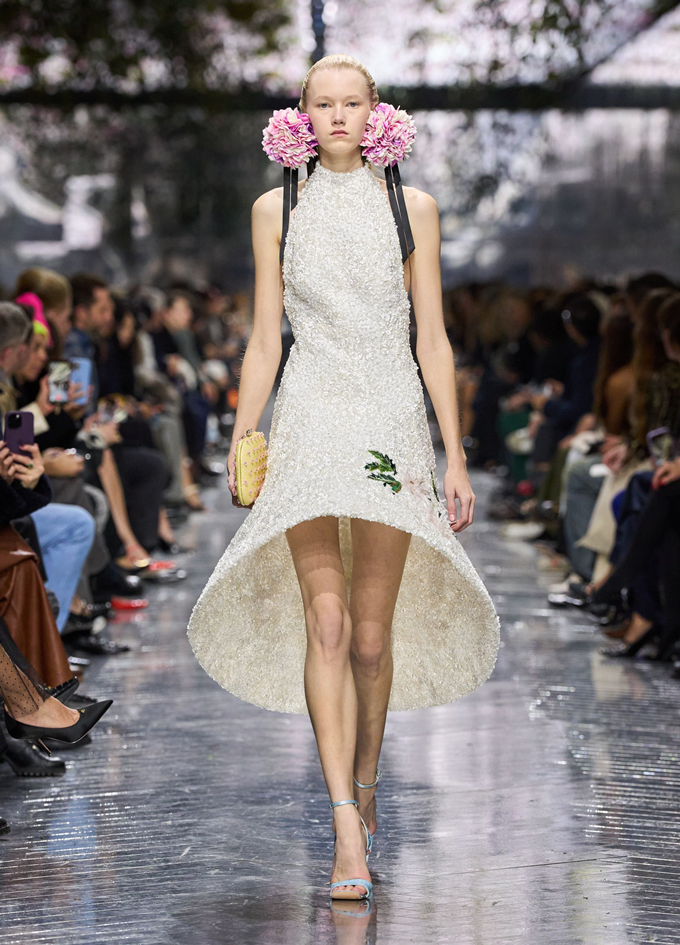 섬세한 실크 재단과 자수, 층층이 쌓인 쉬폰과 오간자, 꾸뛰르 영역으로 확장된 니트웨어는 디올 하우스의 언어를 한층 확장한다.