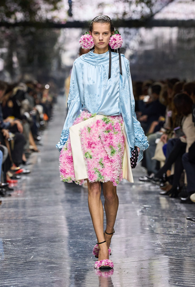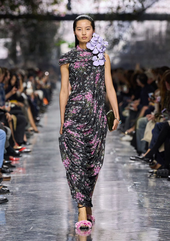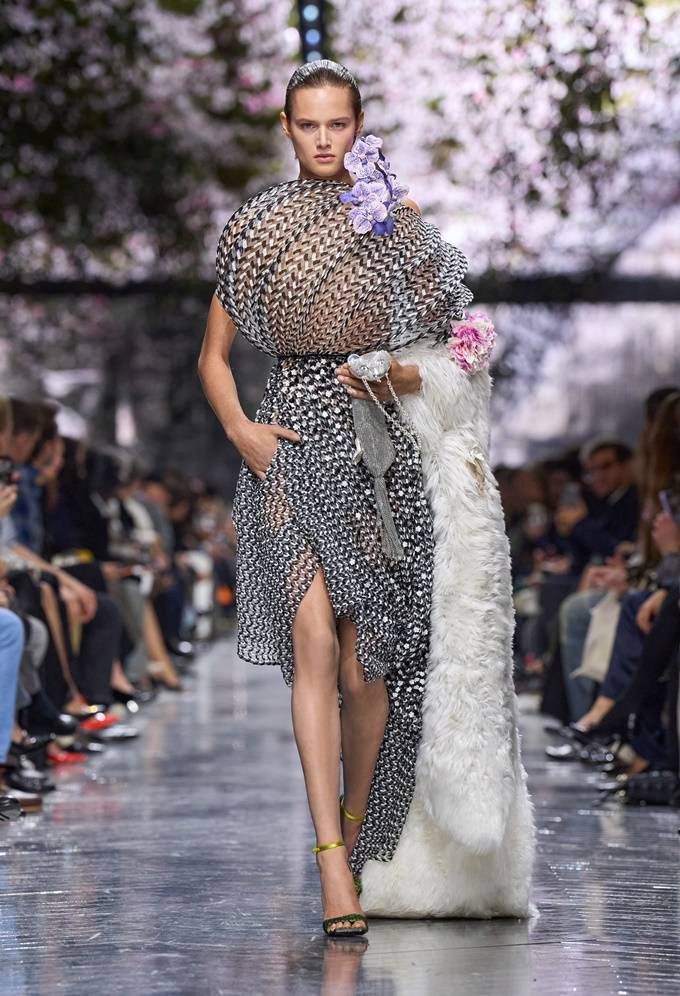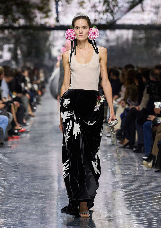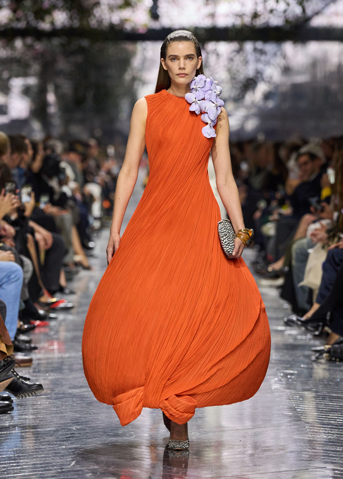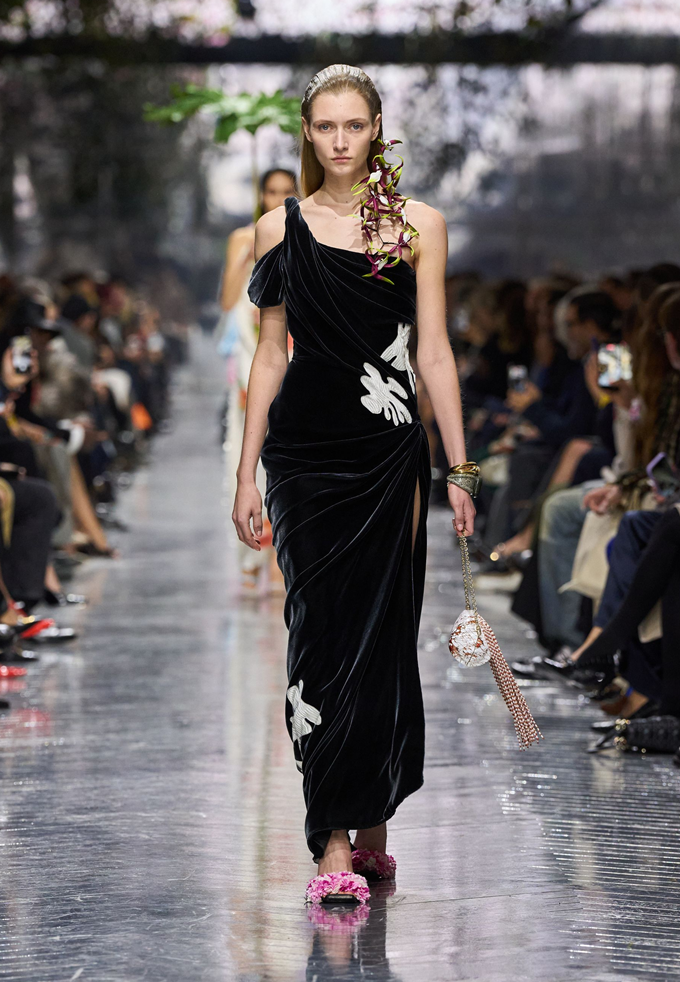 섬세한 실크 재단과 자수, 층층이 쌓인 쉬폰과 오간자, 꾸뛰르 영역으로 확장된 니트웨어는 디올 하우스의 언어를 한층 확장한다.