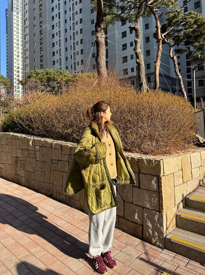 공개한 사진에서 강소라는 레트로 분위기의 베이지 니트 카디건에 깔깔이 롱 패딩을 입고 조거팬츠를 매치한 등원룩으로 내추얼하면서도 편안한 분위기를 자아냈다.