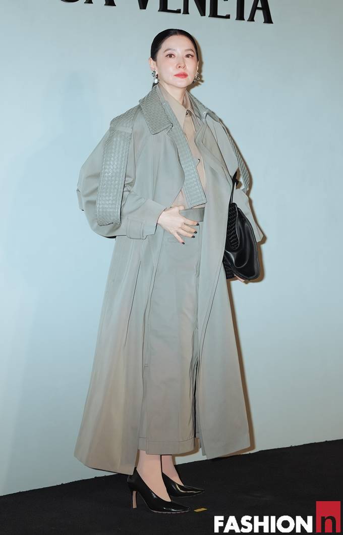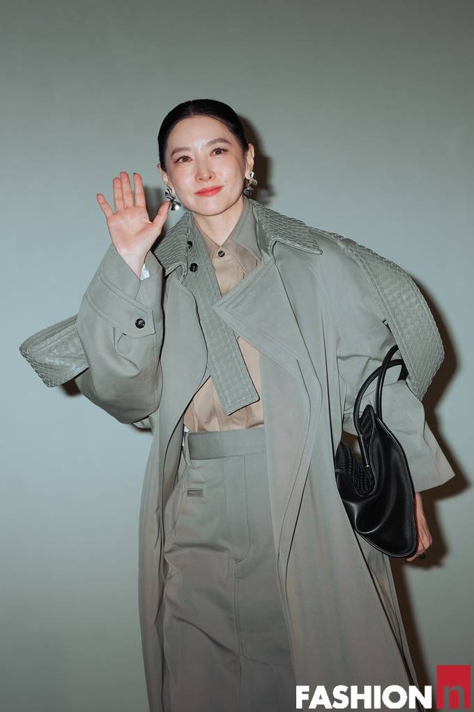 이날 이영애는 톤 다운된 그레이시 카키 컬러에 구조적 실루엣이 돋보이는 롱 코트와 롱 스커트 셋업에 차분한 베이지 셔츠를 매치해 우아하면서도 절제된 감성의 나들이룩을 완성했다.