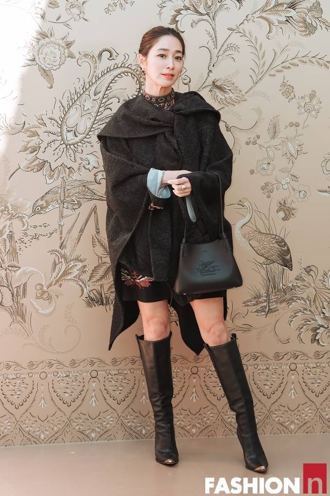 이날 이민정은 클래식하면서도 우아한 케이프 코트에 이너로 페이즐리 미니 원피스를 입고 롱부츠를 매치한 나들이룩으로 럭셔리하면서도 멋스러운 패션 스타일을 완성했다.