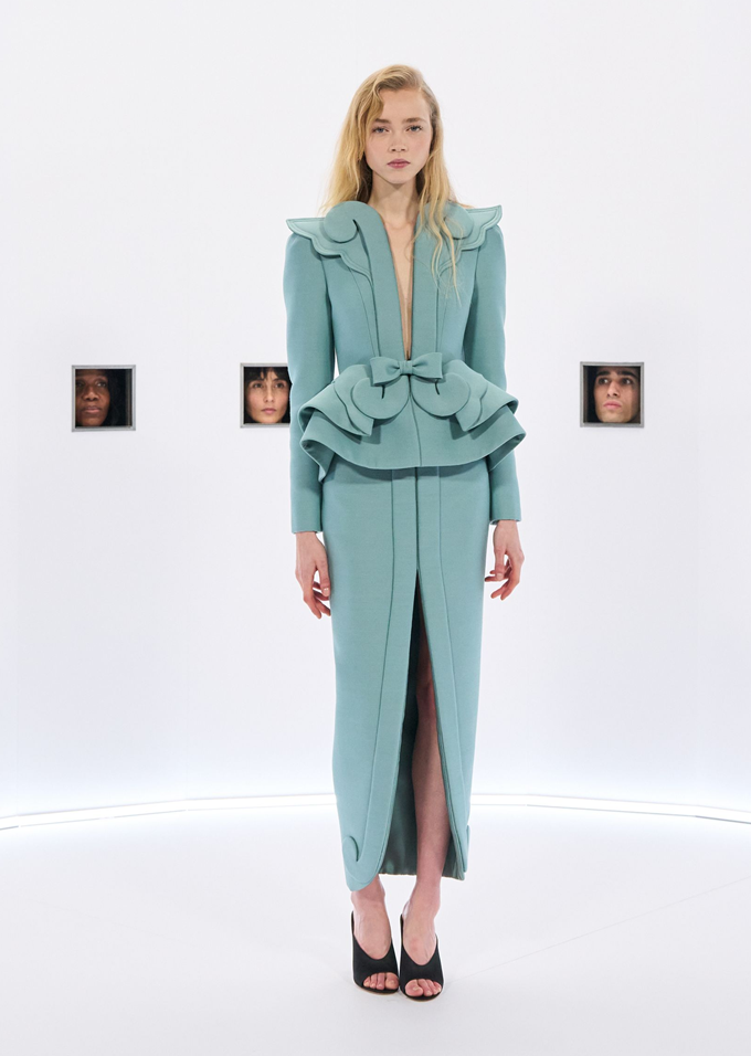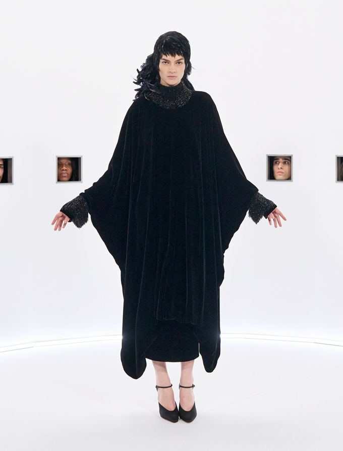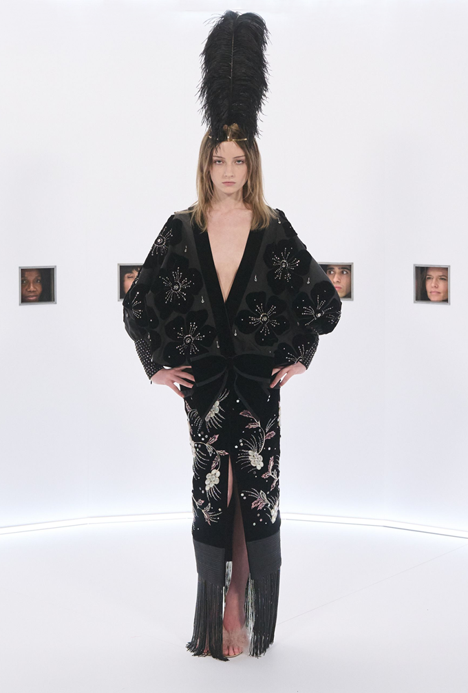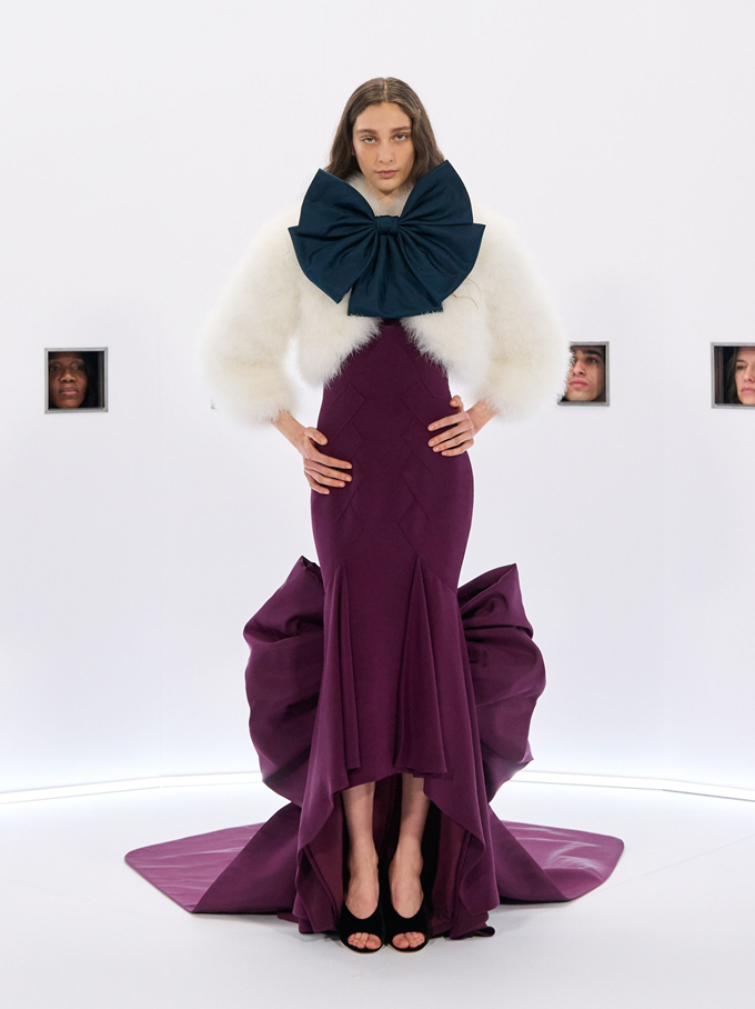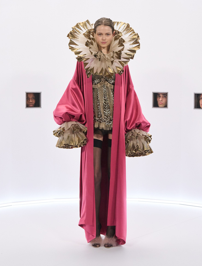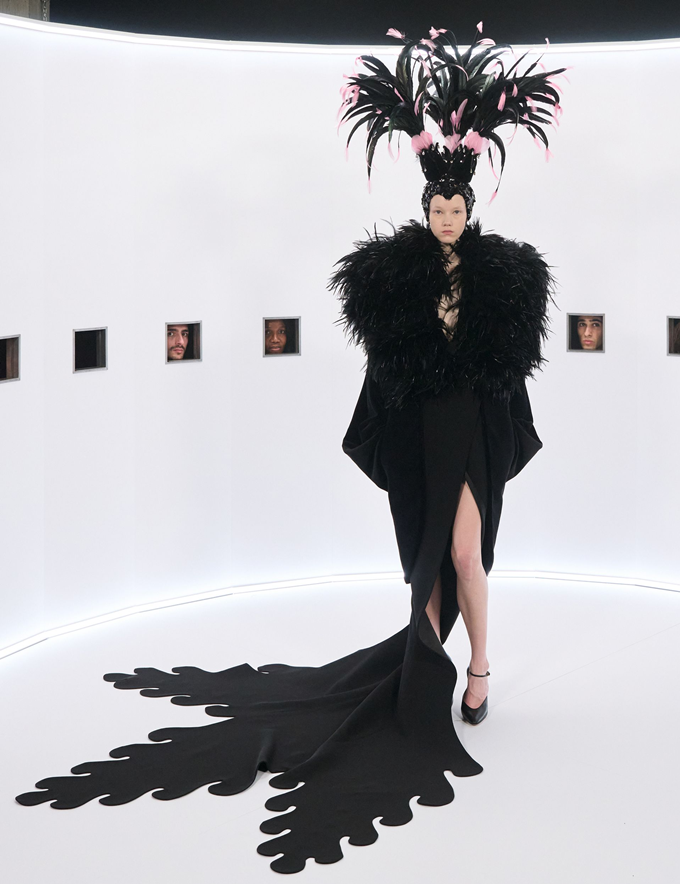 마라부 깃털, 가벼운 망토, 깃털 왕관, 위풍당당한 러프는 과함을 두려워하지 않으면서도 극도의 장인 정신으로 절제된 연극적인 분위기를 자아냈다.