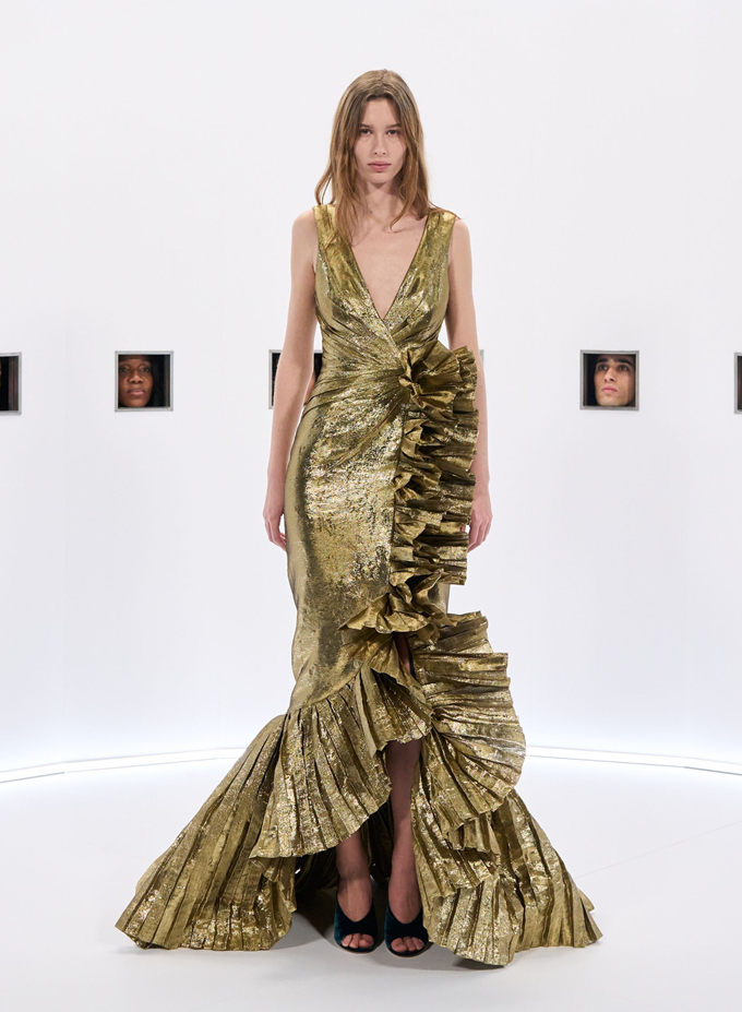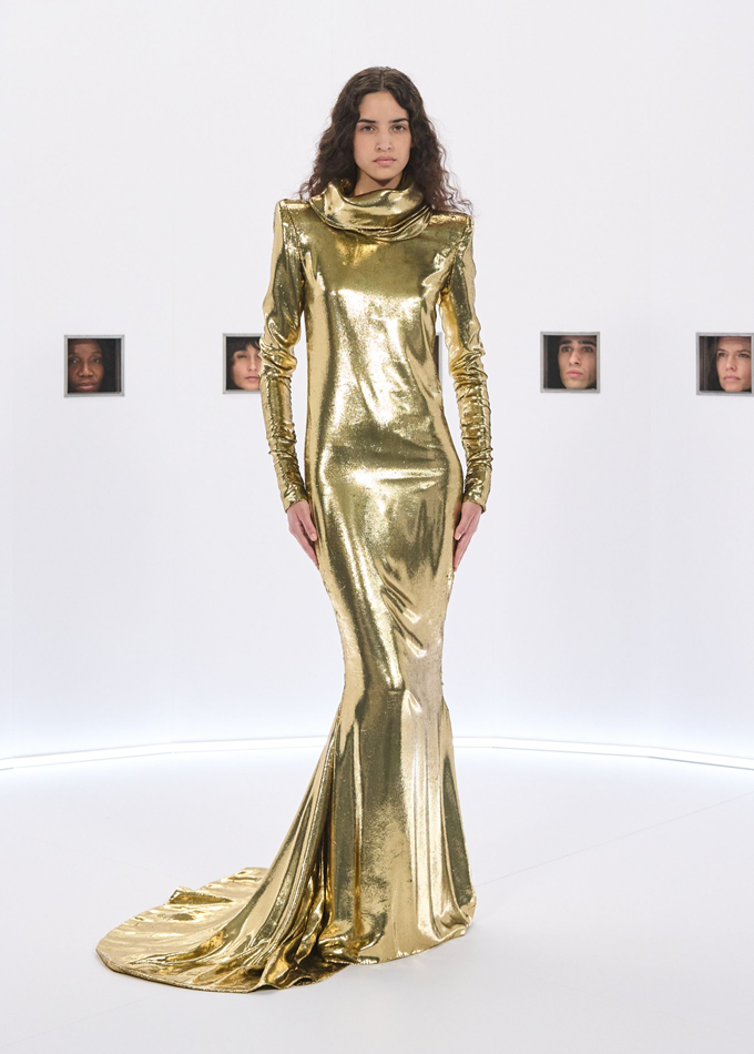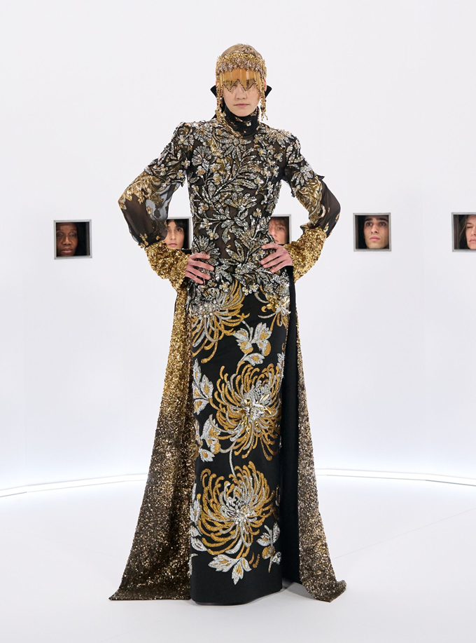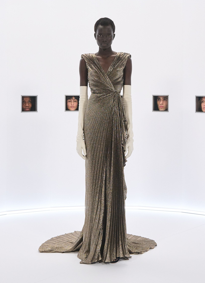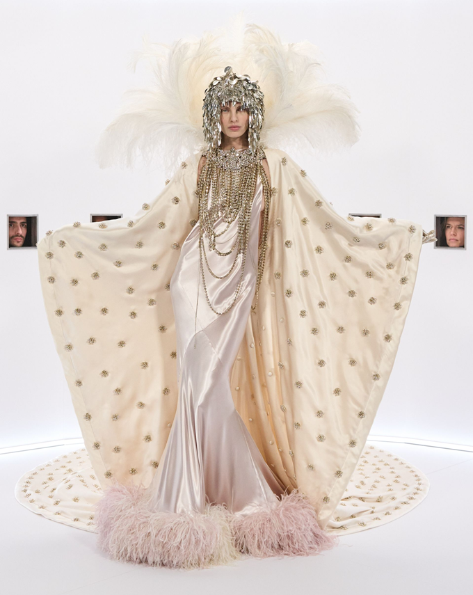 알레산드로 미켈레 고유의 맥시멀리즘 미학은 영화배우를 연상시키는 드레스로 단순히 캐릭터보다 무대 위의 존재감을 가진 올드 할리우드 시대의 화려한 의상을 소환했다.