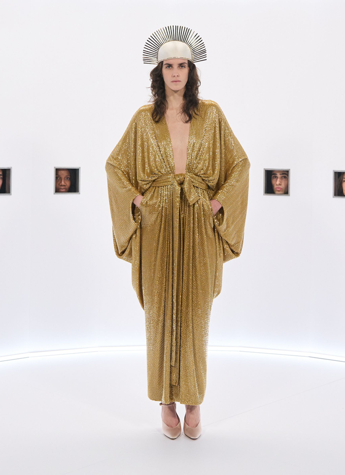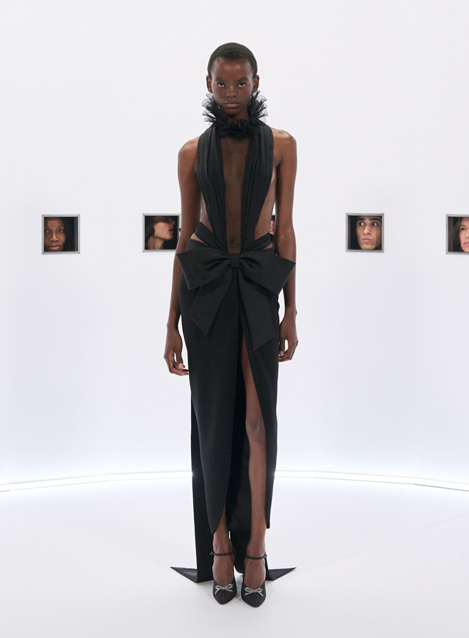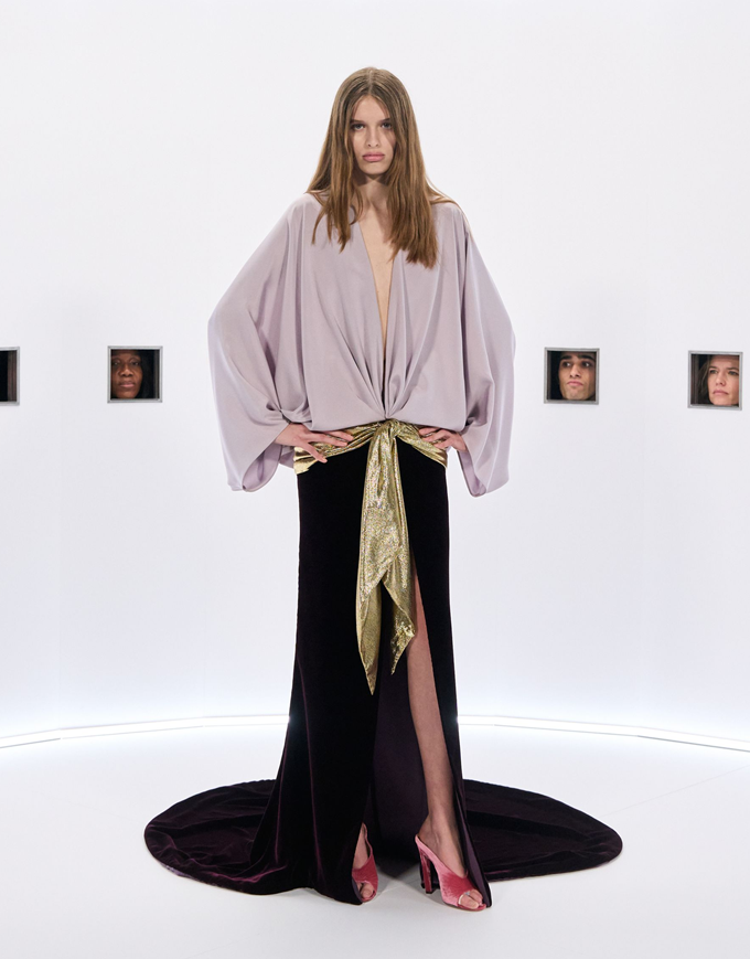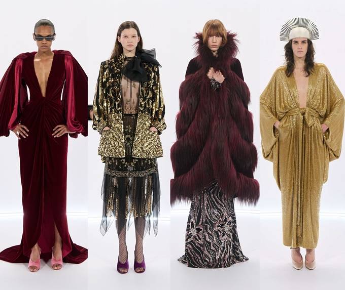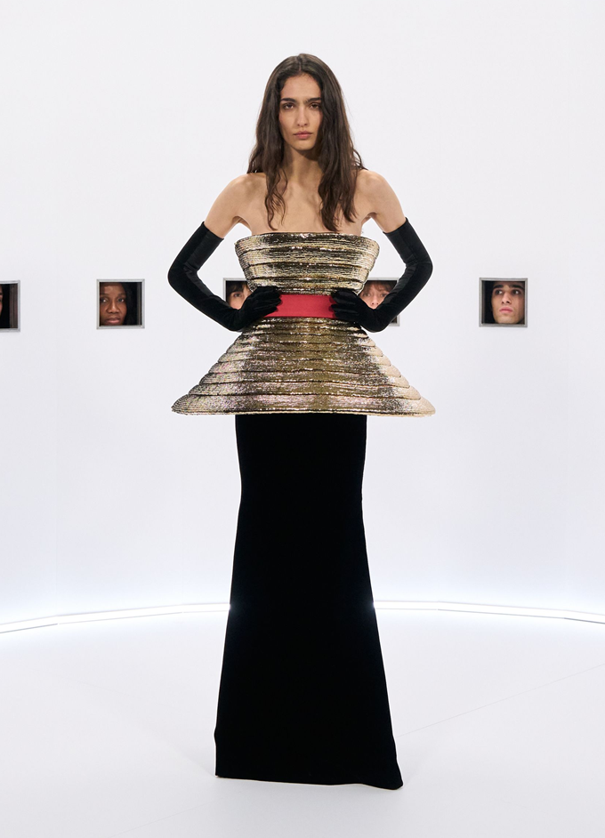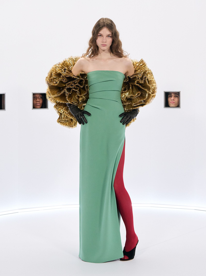 알레산드로 미켈레 고유의 맥시멀리즘 미학은 영화배우를 연상시키는 드레스로 단순히 캐릭터보다 무대 위의 존재감을 가진 올드 할리우드 시대의 화려한 의상을 소환했다.