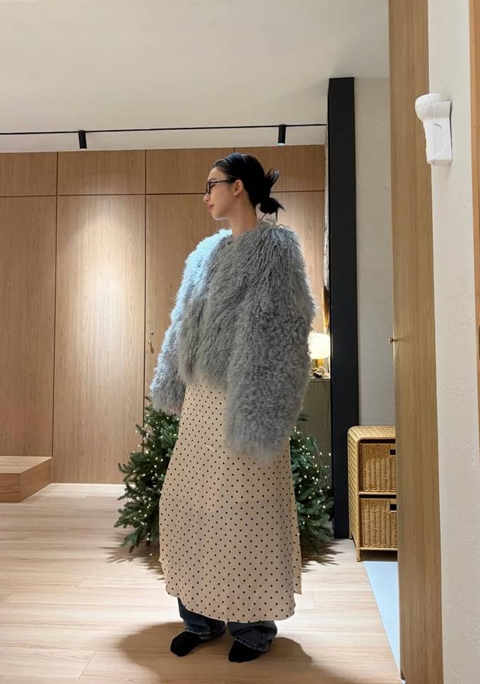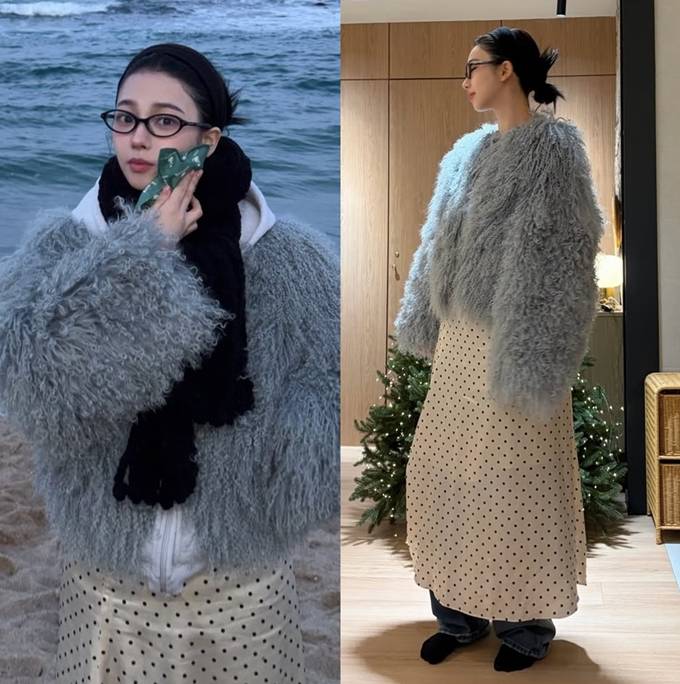 카리나는 볼륨감이 살아 있는 그레이 톤의 퍼 재킷에 블랙 컬러의 두툼한 머플러를 두르고, 화이트 이너와 도트 패턴 스커트를 매치해 러블리하면서도 포근한 여행룩을 완성했다.