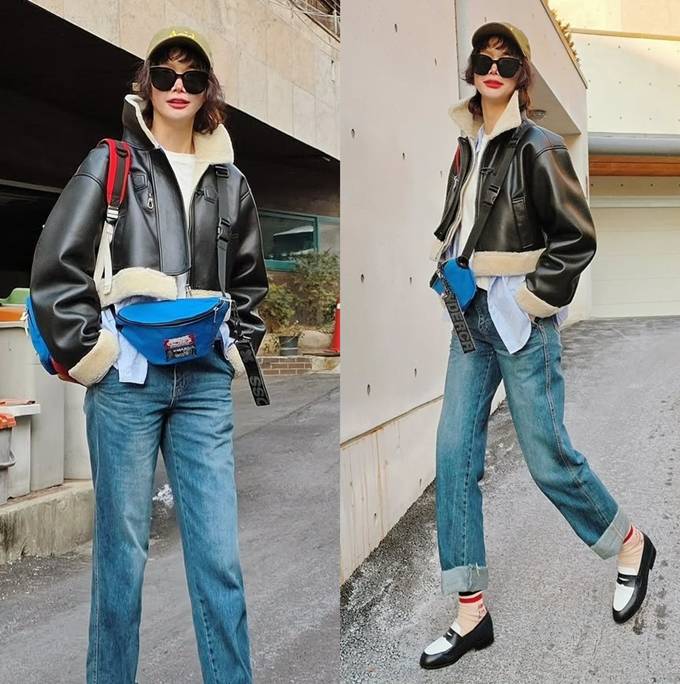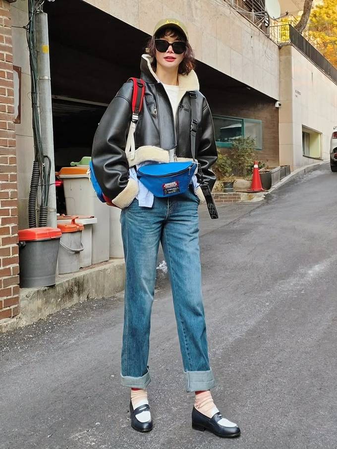 송경아는 묵직한 소재감의 레더 재킷이지만, 자연스럽게 떨어지는 핏과 살짝 여유 있는 실루엣 덕분에 부담 없은 데일리룩을 연출했다.