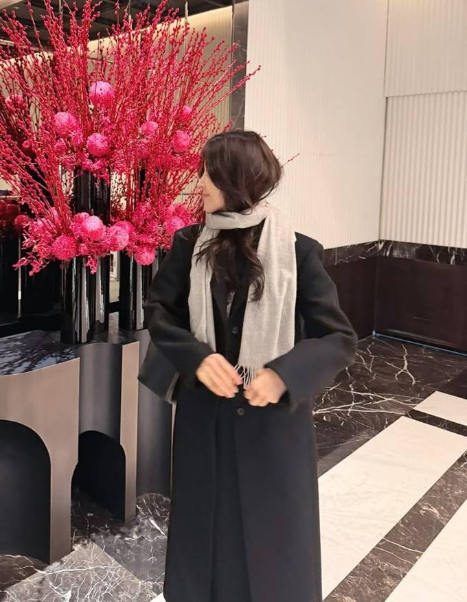 또 이너로 아이보리 터틀넥을 입고 오트밀 컬러의 머플러를 매치해 차분하면서도 단아한 분위기를 자아냈다.