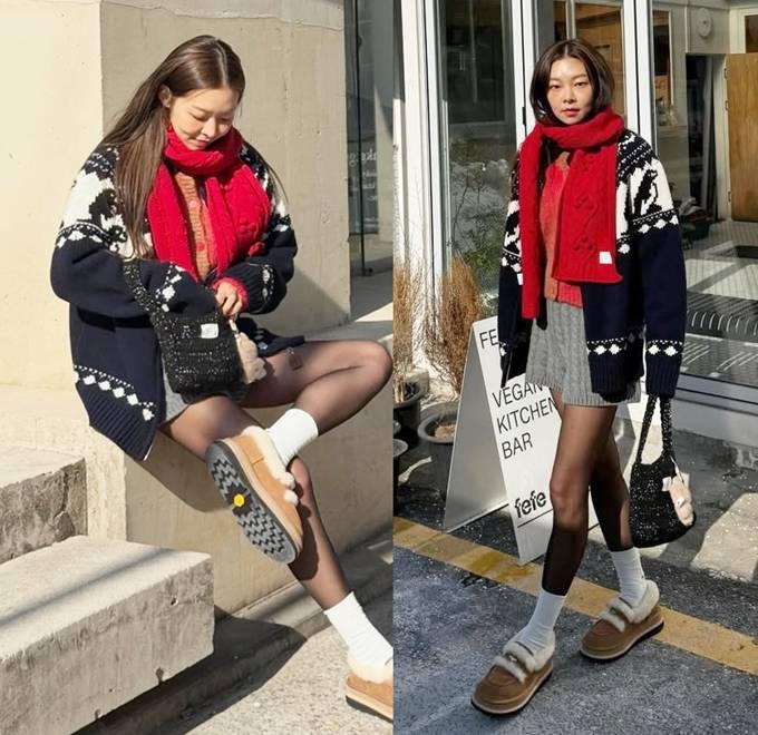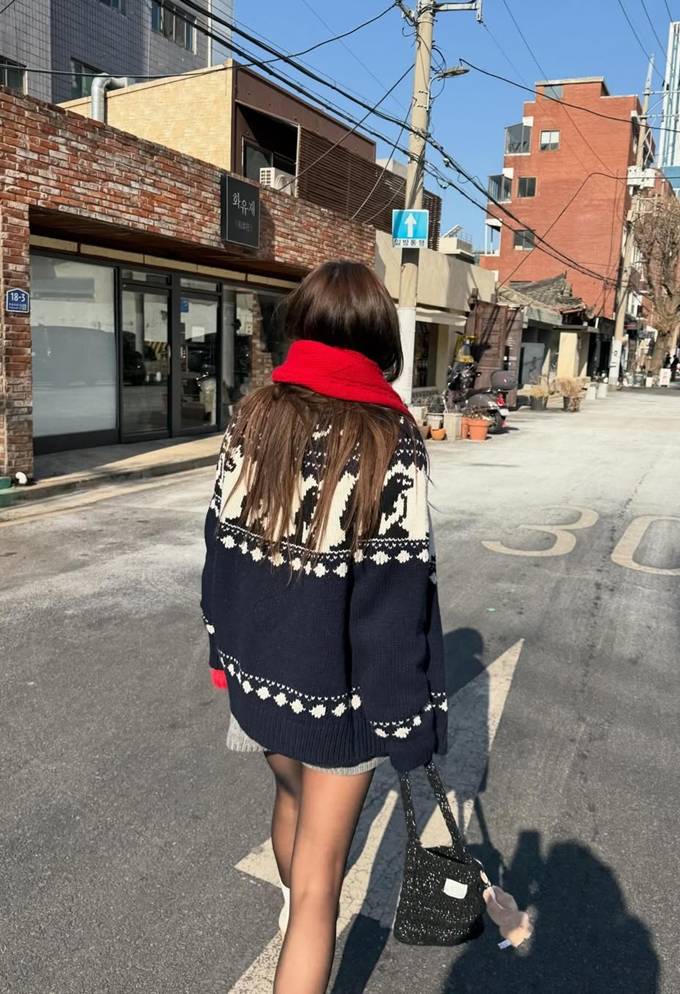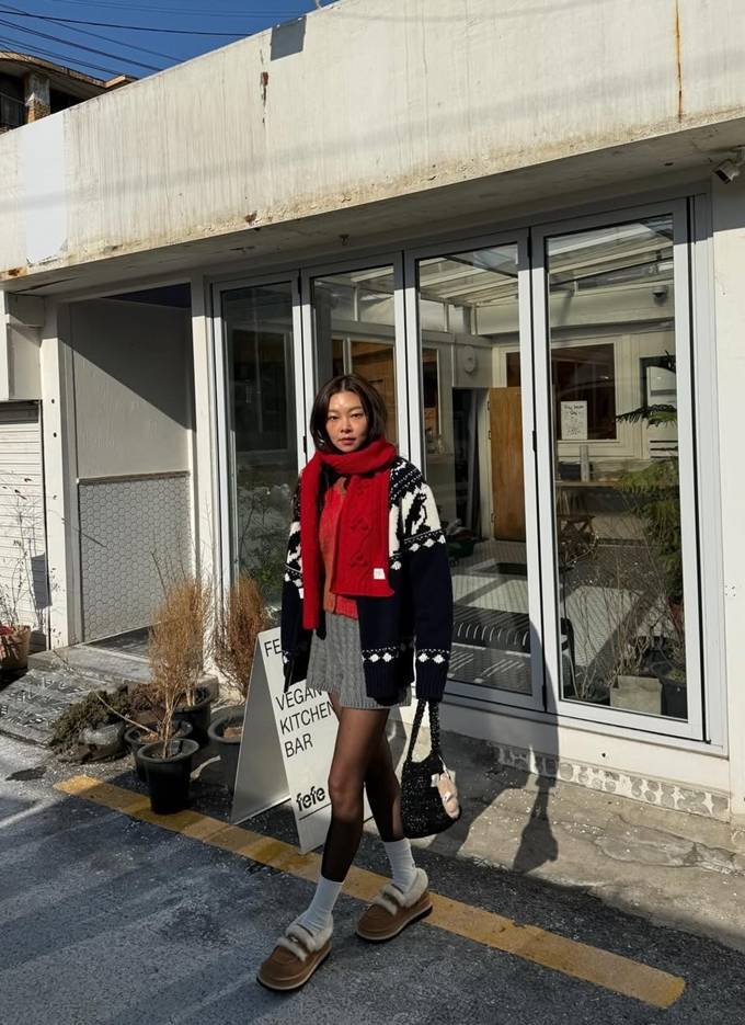 송해나는 클래식한 패턴이 돋보이는 니트 카디건에 레드 컬러의 니트 머플러를 두르고 늘씬한 각선미가 드러난 니트 미니 쇼츠에 블랙 스타킹과 화이트 삭스, 퍼 디테일의 로퍼를 매치해 하이틴 소녀 같은 프레피룩을 완성했다.