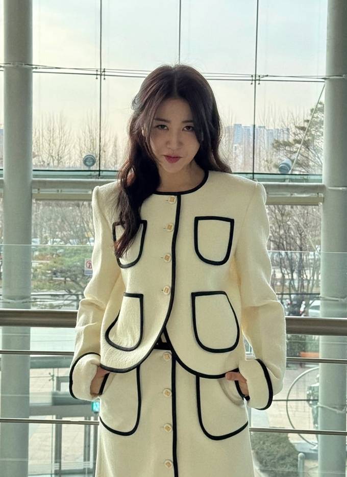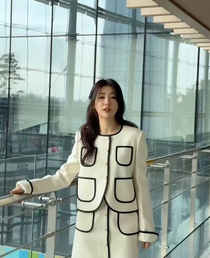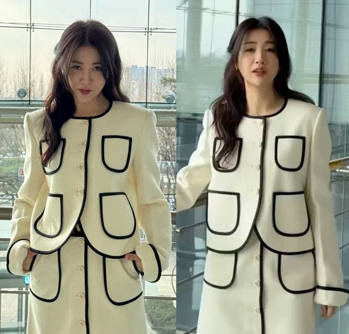 공개한 사진과 영상에서 박하선은 블랙 파이핑 디테일이 더해진 아이보리 컬러의 트위드 재킷과 스커트의 투피스 슈트룩으로 단정하면서도 우아한 출근 패션을 완성했다.