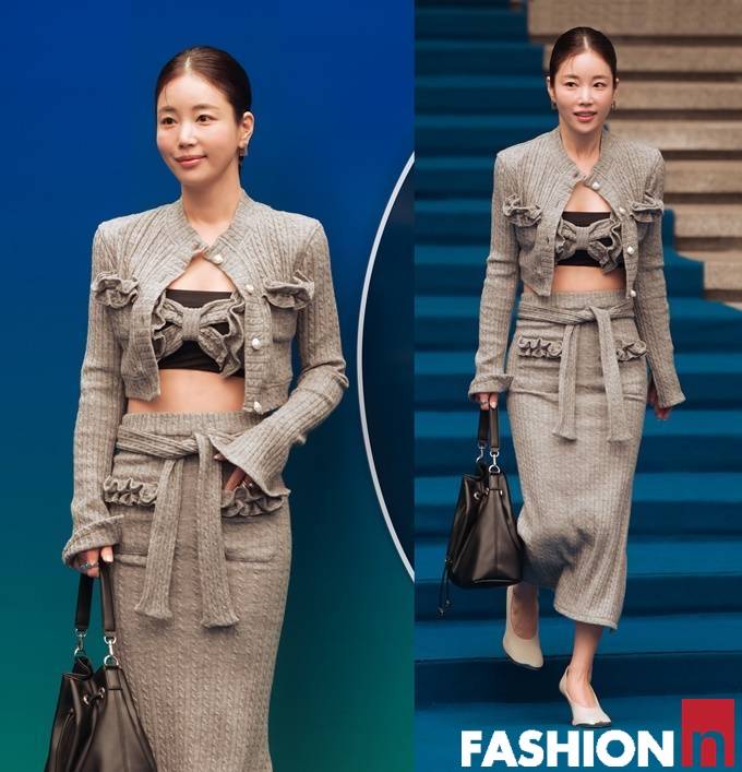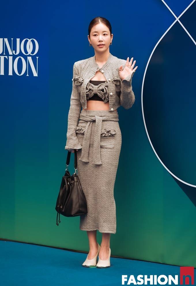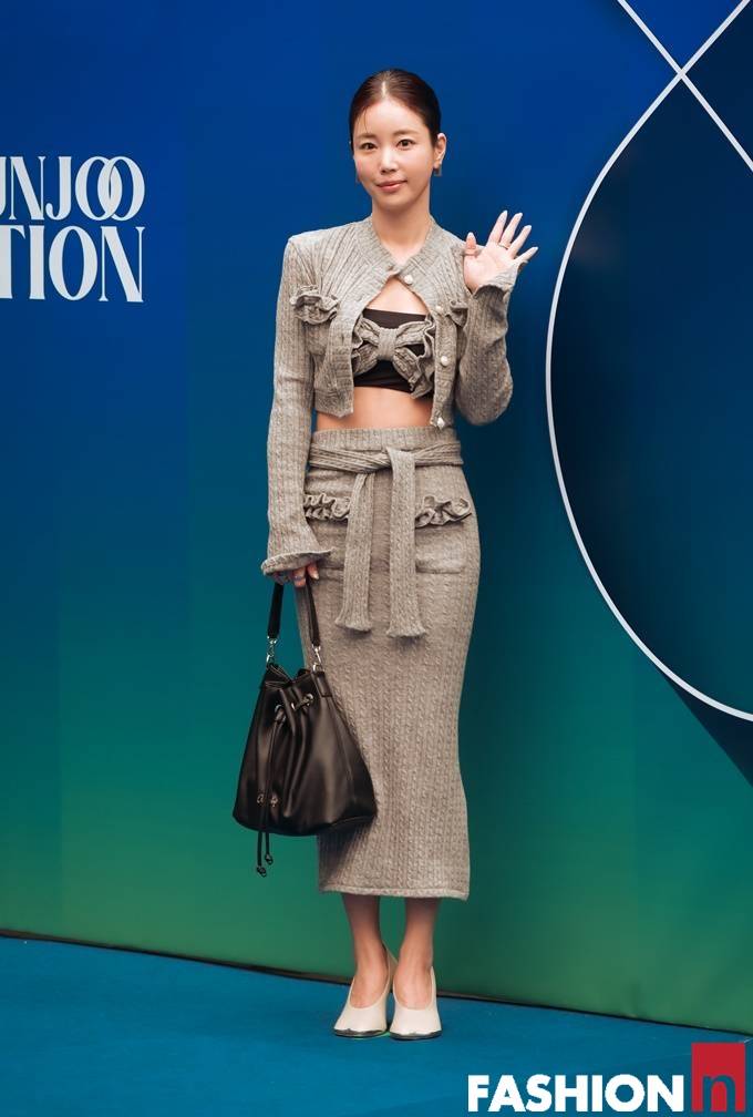 곽현주 쇼에 참석한 기은세는 이날 밴드 리본 디자인의 브라렛을 매치한 크롭 투피스룩으로 패셔니스타의 센스를 발휘했다.