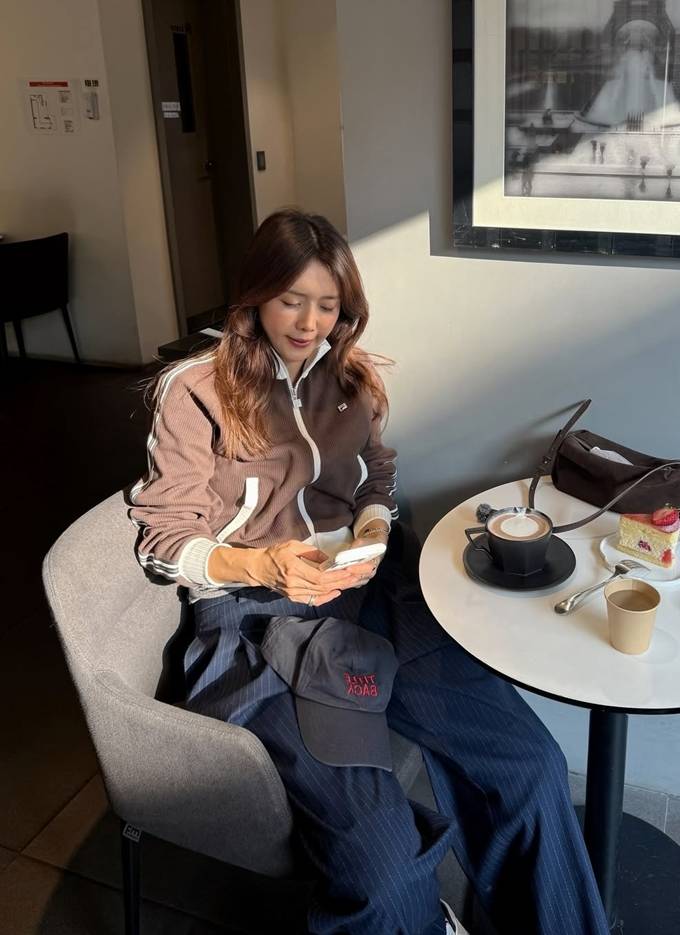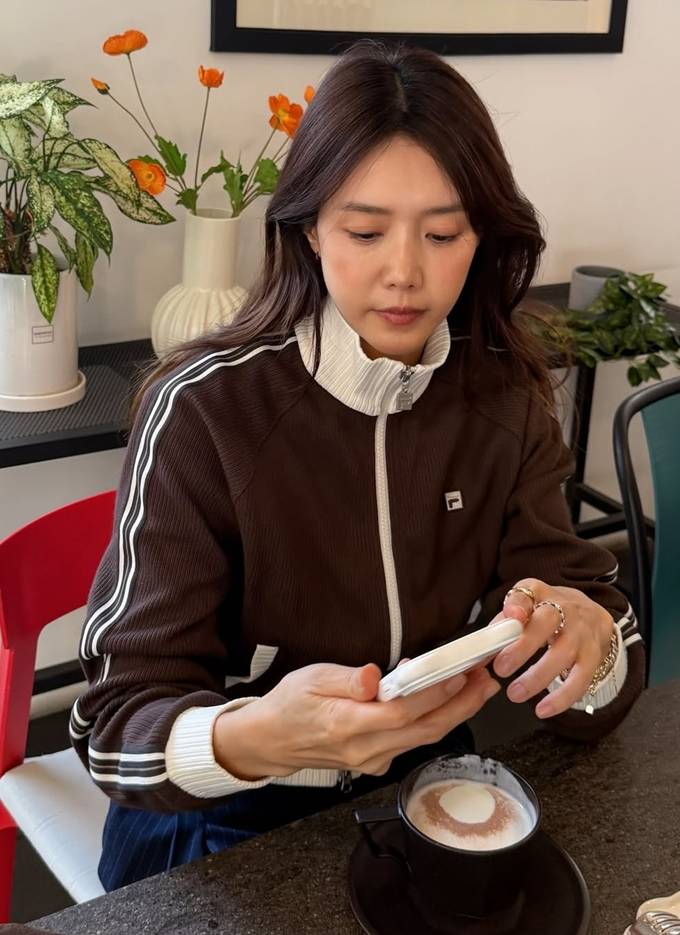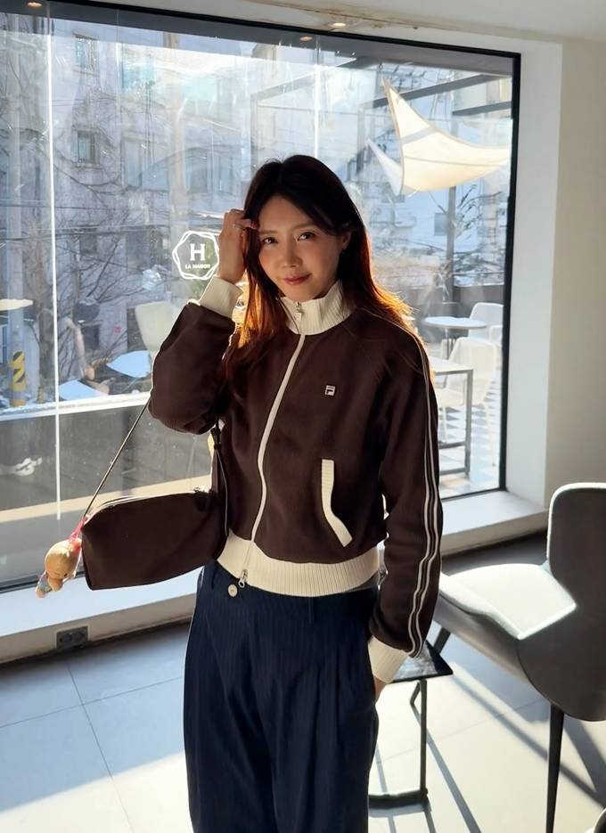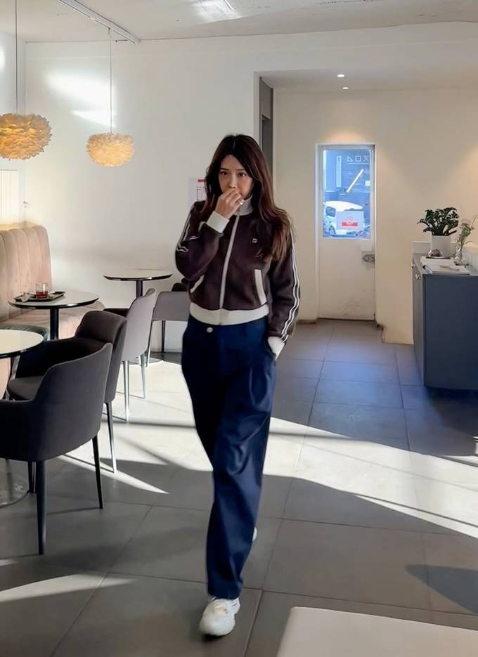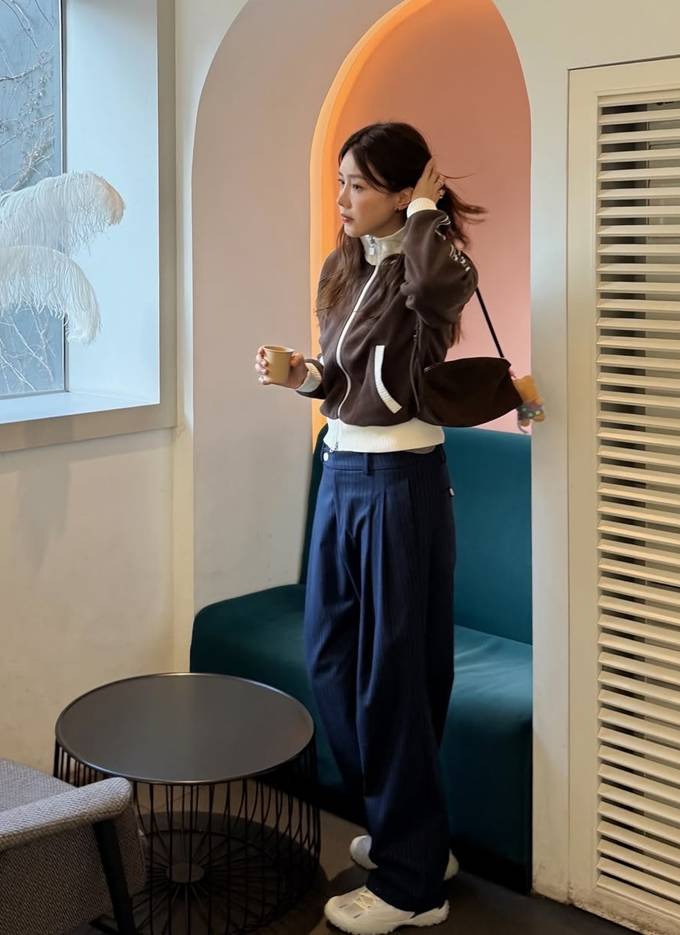 채정안, 트랙 재킷 매치가 완벽! 클래식 슈트 팬츠와 만난 블록코어 데일리룩
