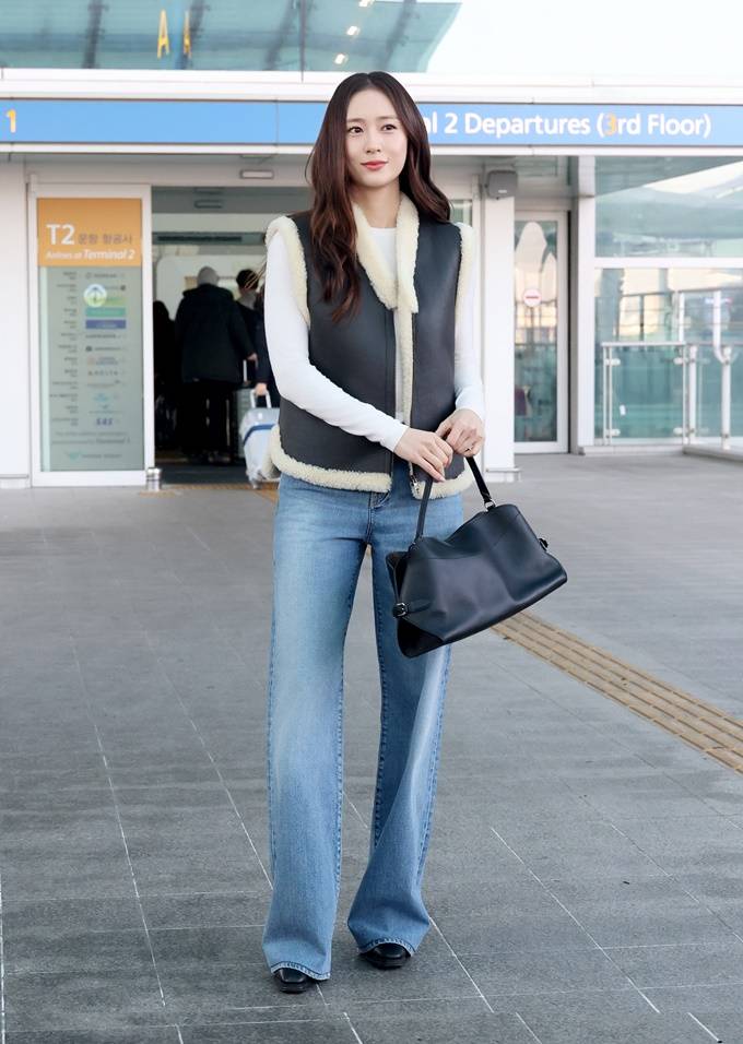 정수정, 청바지와 딱! 시어링 레더 베스트로 끝낸 탐나는 간절기룩 뉴욕 출국길