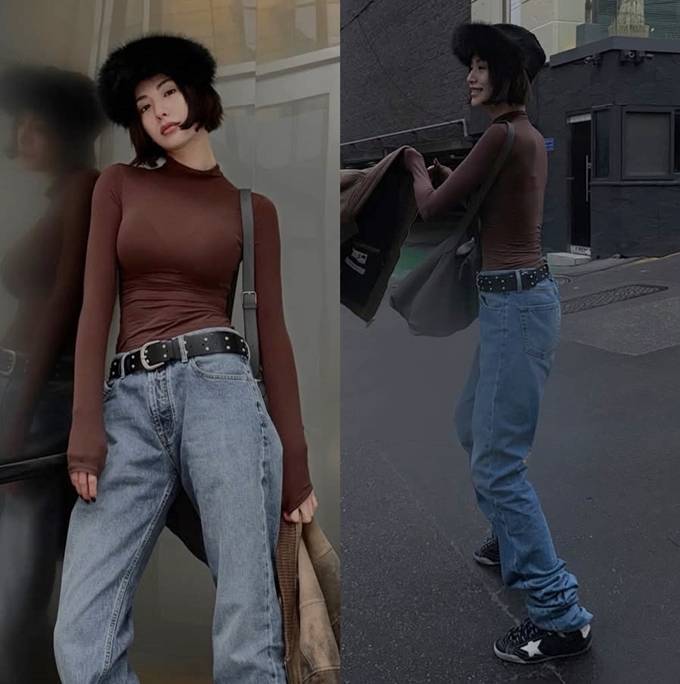 공개한 사진에서 나나는 포근한 샤프카 햇에 브라운 컬러의 밀착 터틀넥 입고 루즈핏 데님 팬츠를 매치해 자연스러우면서도 쿨한 스트릿 무드를 완성했다.