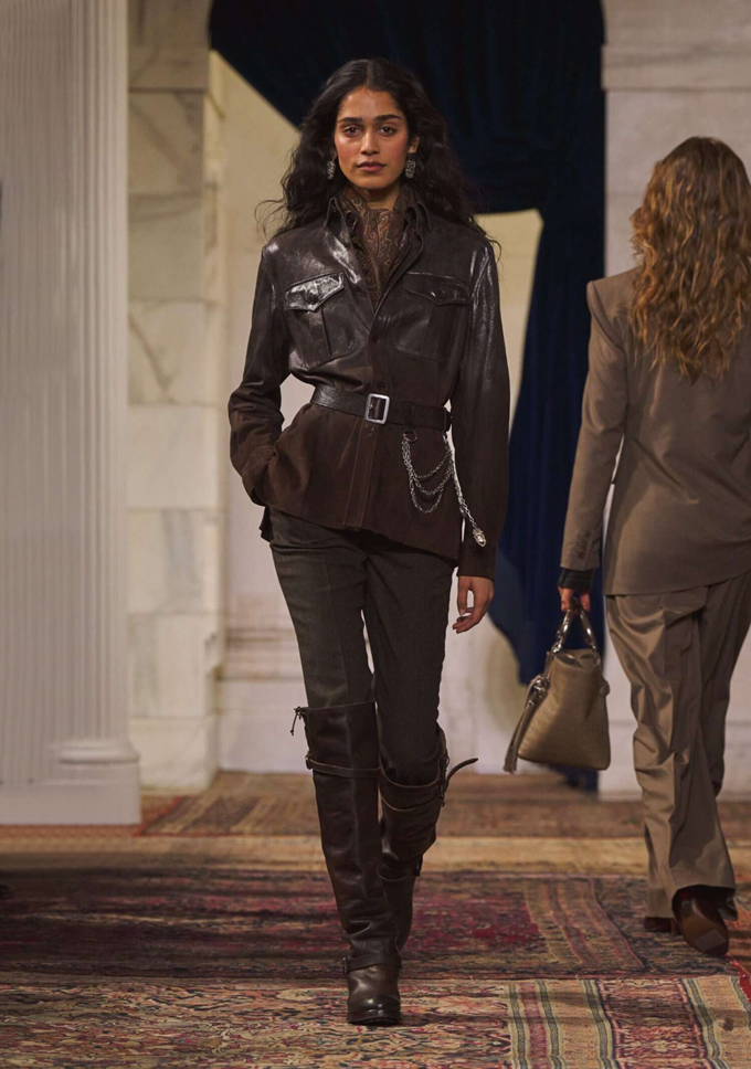 랄프 로렌의 이번 여성복 컬렉션은 브라운 계열 색상과 다양한 질감의 테일러링 재킷, 블레이저, 레딩고트, 거친 질감의 도네갈 트위드, 최고급 자카드, 아름다운 자수 실크 등 정교하고 여성스러운 클래식과 반항적인 기질이 조화를 이루며 이중적인 감각을 표현했다.