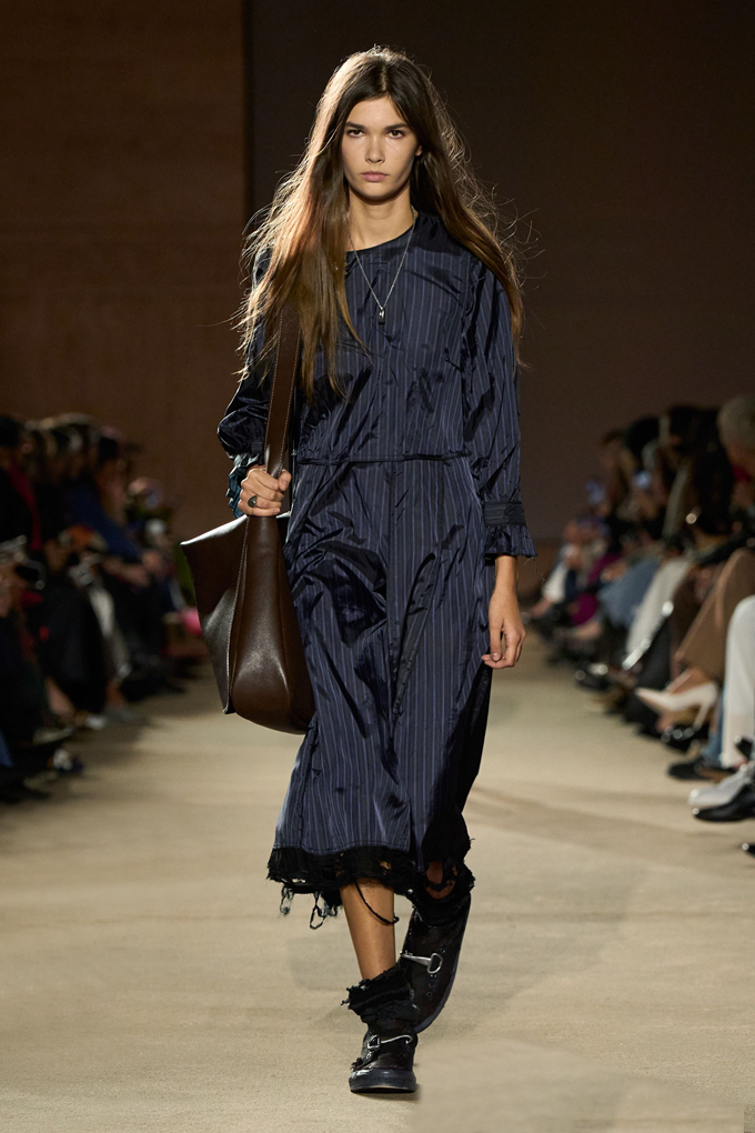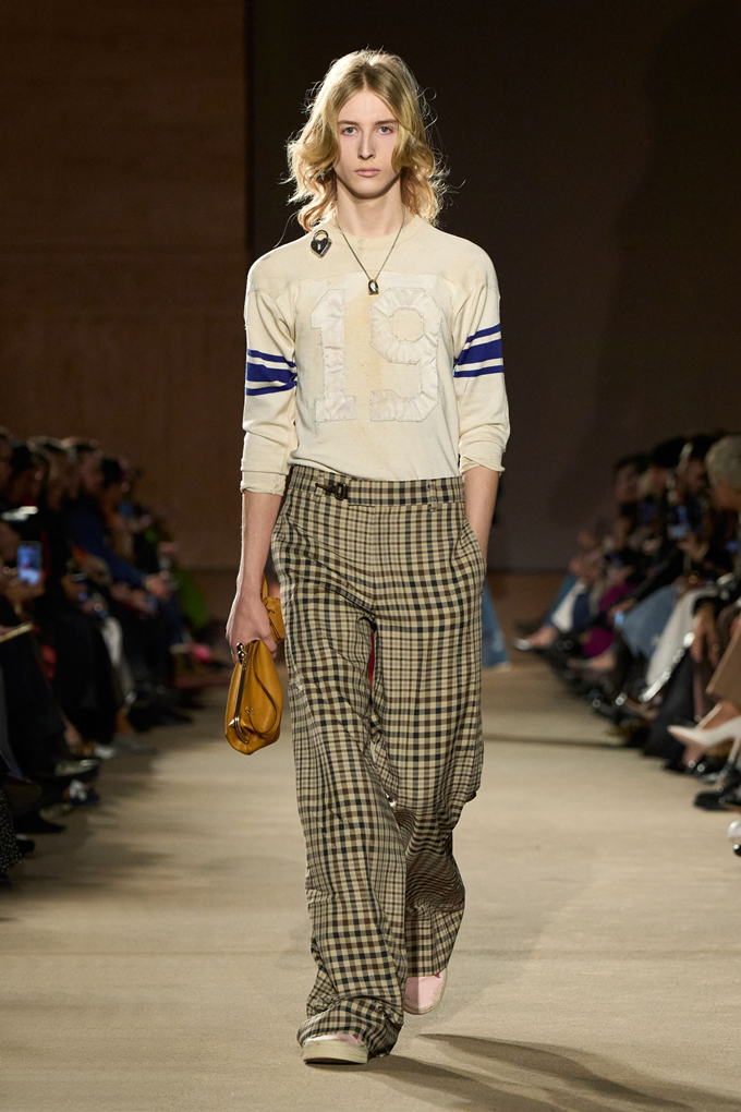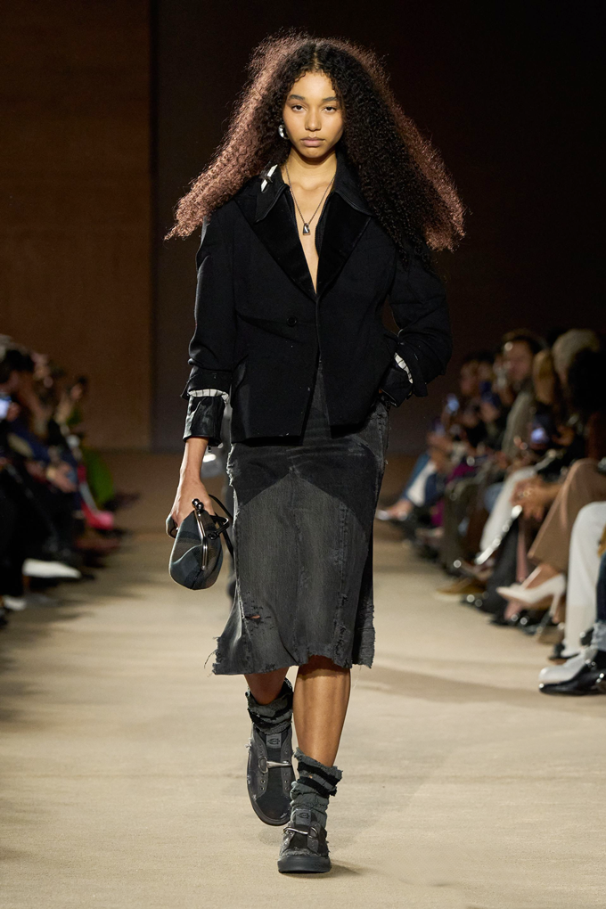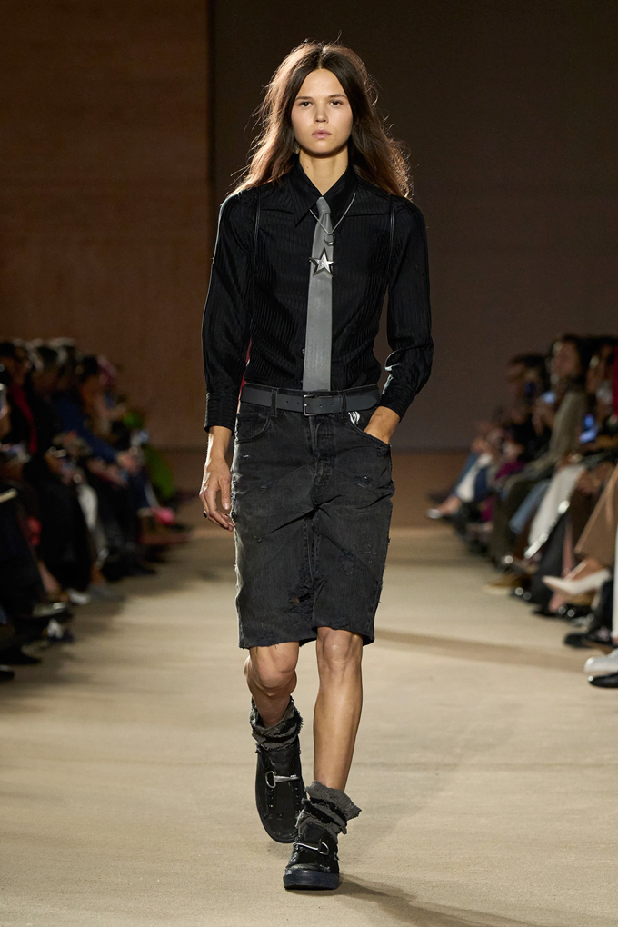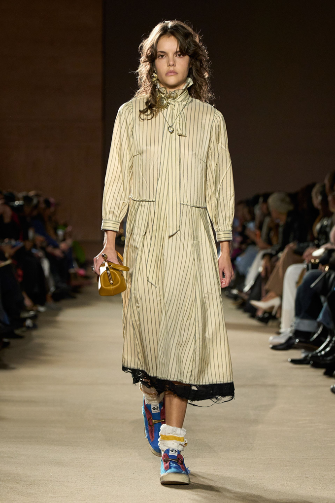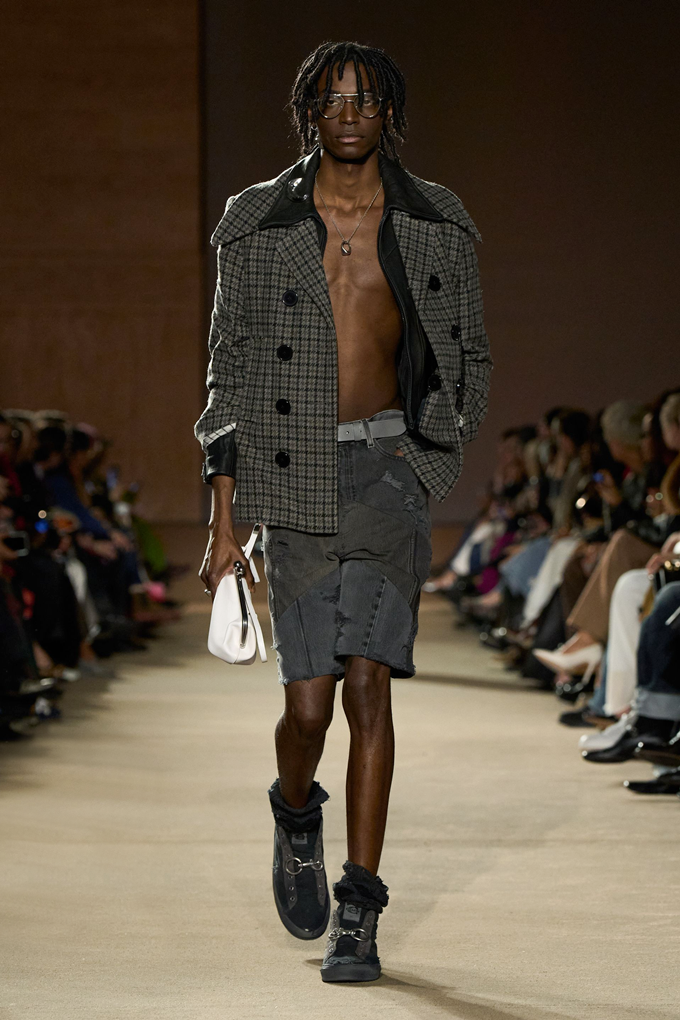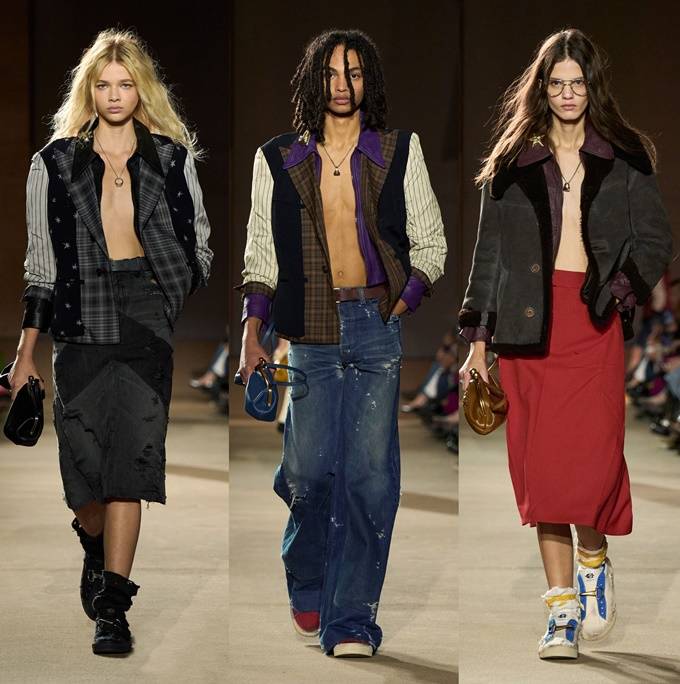 체크무늬 블레이저 안에 가죽 재킷을 레이어드한 스타일를 비롯해 미스 걸치(Miss Gulch)를 연상시키는 찢어진 레이스 밑단의 프레리 드레스, 무릎 길이 버뮤다 데님 반바지 등이 눈길을 끌었다.