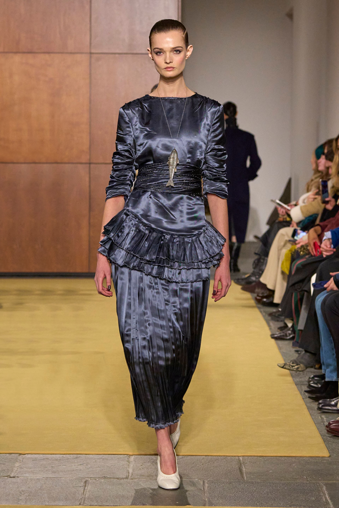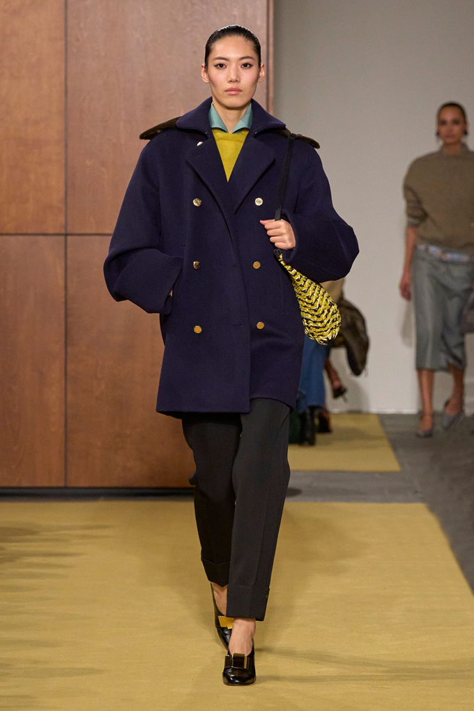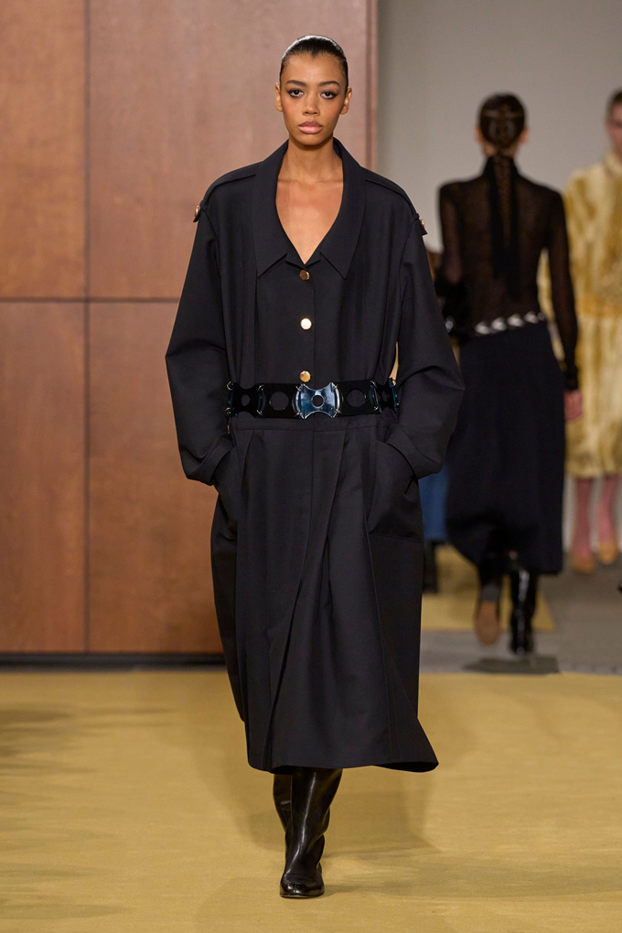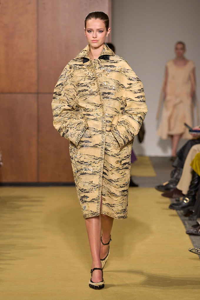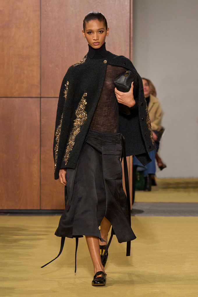 풍성한 볼륨의 코트를 걸친 모습은 컬렉션에 위엄을 더했고, 허리선이 낮은 스커트 등이 눈길을 사로잡았다.