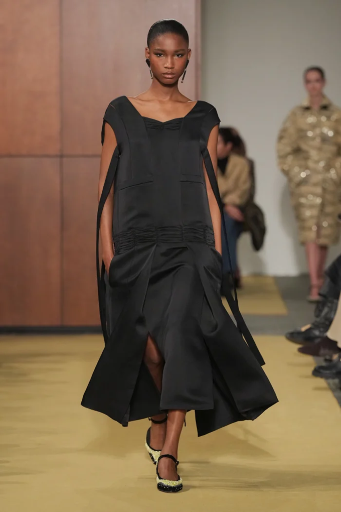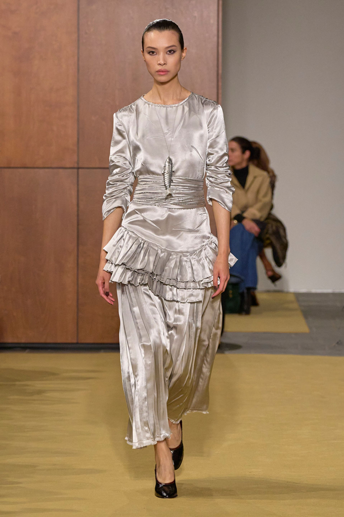 드레스의 허리선은 솔기가 풀린 채로 낮아졌고 날카로운 재단은 가죽으로 감싼 조개껍질 귀걸이, 정어리 브로치, 손으로 짠 가죽과 라피아 가방으로 포인트를 주었다.