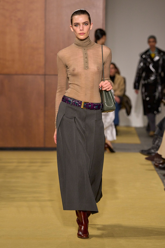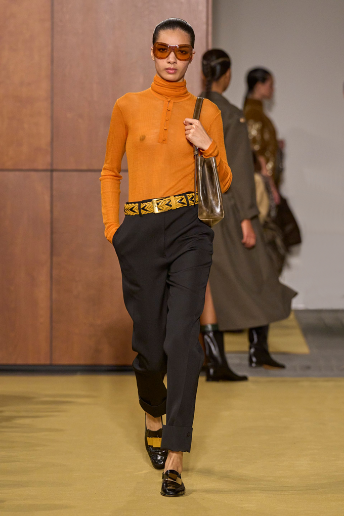 깔끔한 피터팬 칼라 버튼업 블라우스, 맞춤형 터틀넥 트렌치 코트, 매우 얇은 터틀넥 헨리넥 탑, 보트넥 피셔맨 스웨터, 그리고 낮이나 밤에 입기 좋은 아름다운 주름 장식의 실크 긴팔 드레스에 반영되었다.