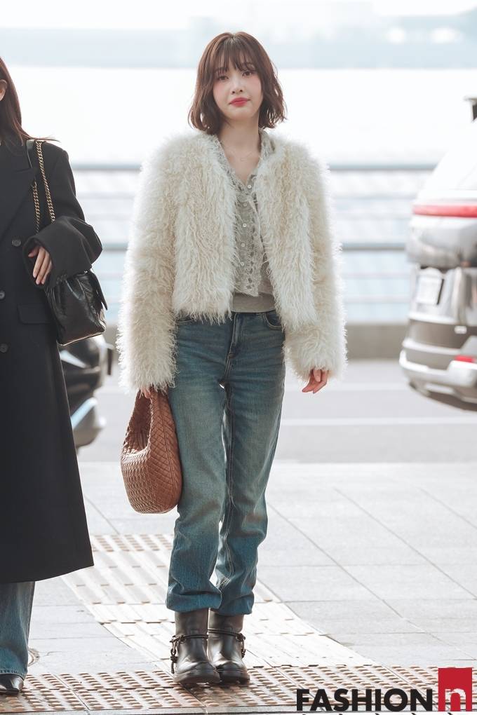 이날 조이는 단발 헤어 스타일에 복슬복슬한 퍼 볼륨이 돋보이는 볼레로 재킷에 데님 팬츠를 매치한 출국룩으로 러블리하면서도 힙한 스타일을 서보였다.