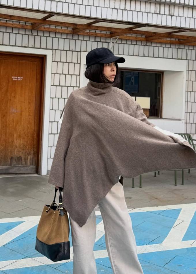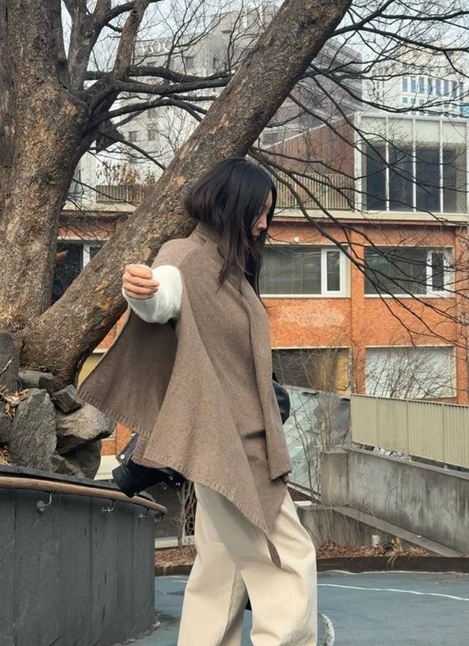 복잡한 레이어드 없이도 단 하나의 아이템으로 체형을 부드럽게 감싸며 우아한 분위기를 배가시켰으며, 와이드한 소매 라인으로 마치 망토를 두른 듯한 드라마틱한 실루엣을 완성했다.