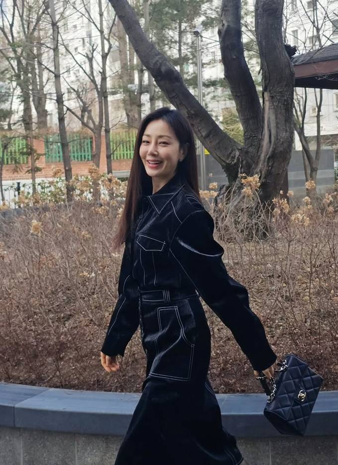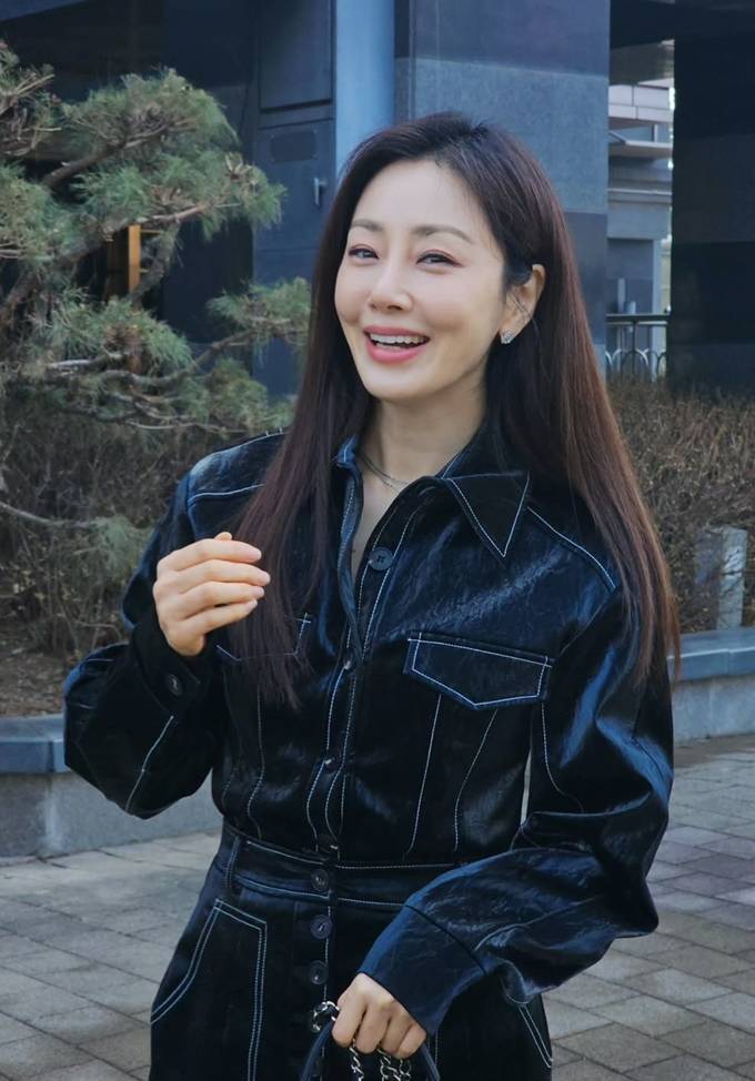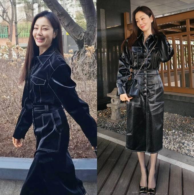 배우 오나라가 블랙 레더 셔츠와 스커트 셋업의 레더룩으로 신부 보다 더 예쁜 민폐 하객룩을 선보였다.