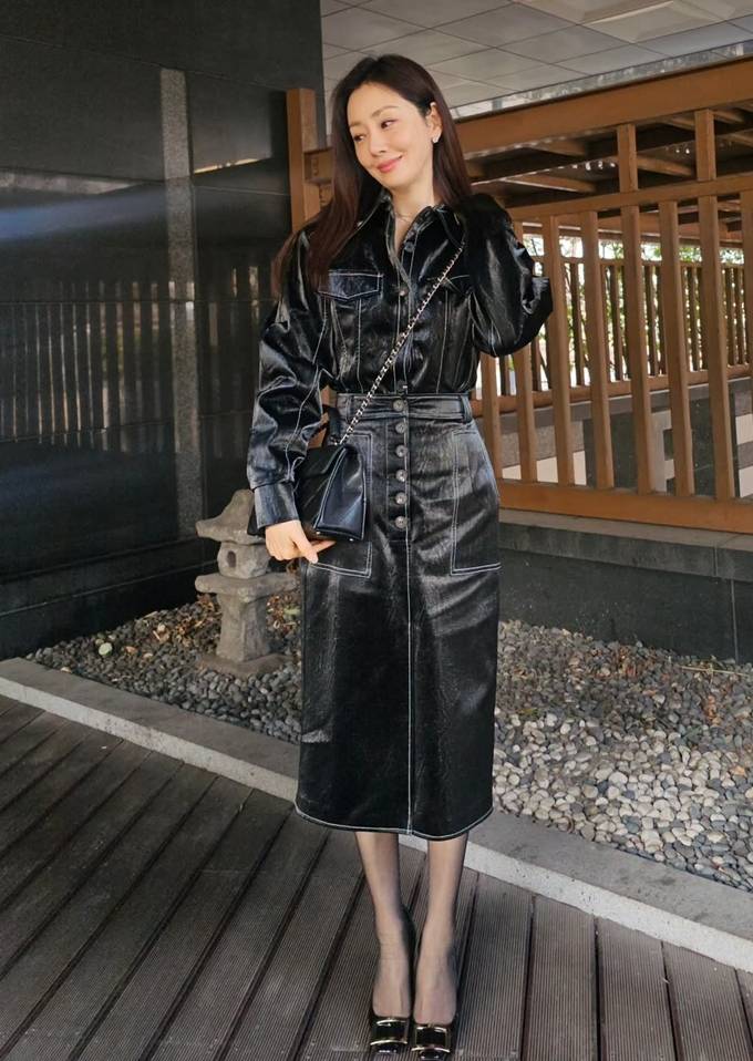 오나라, 결혼식 가는 멋쟁이! 존재감 발산 광택 레더 셔츠와 스커트 셋업 민폐 하객룩