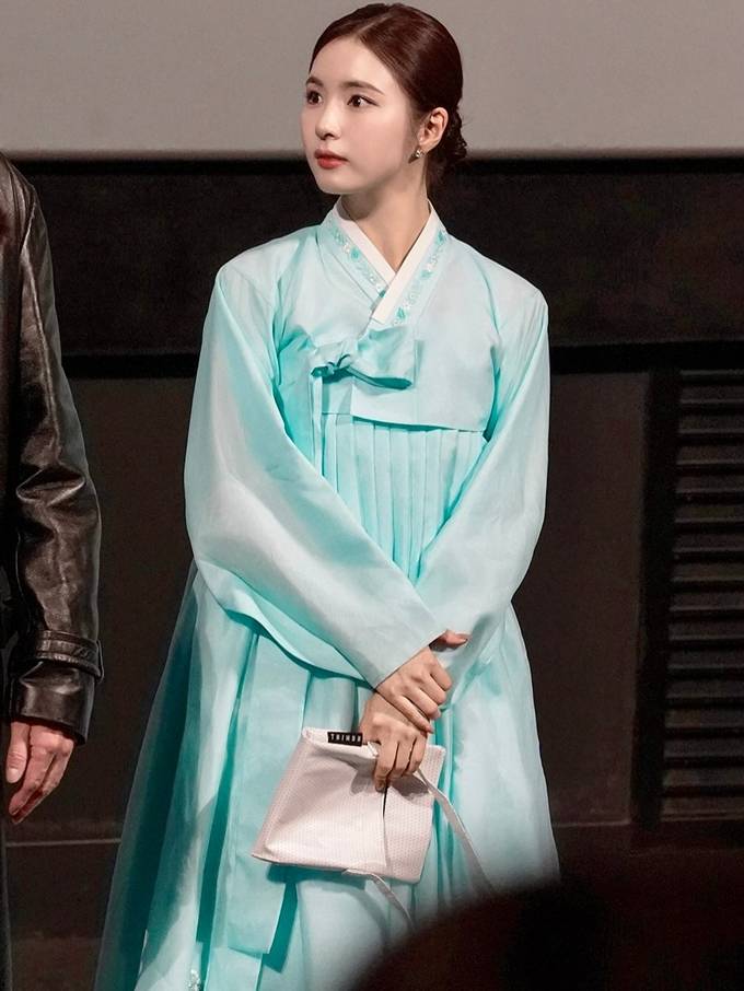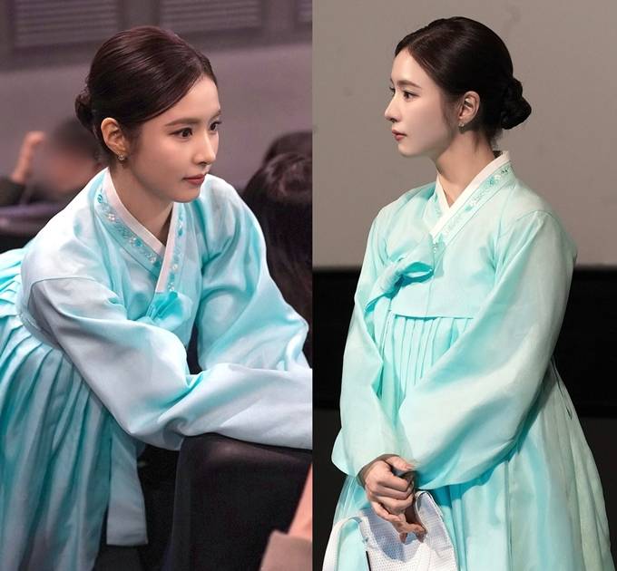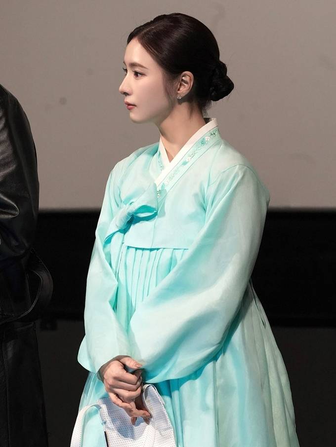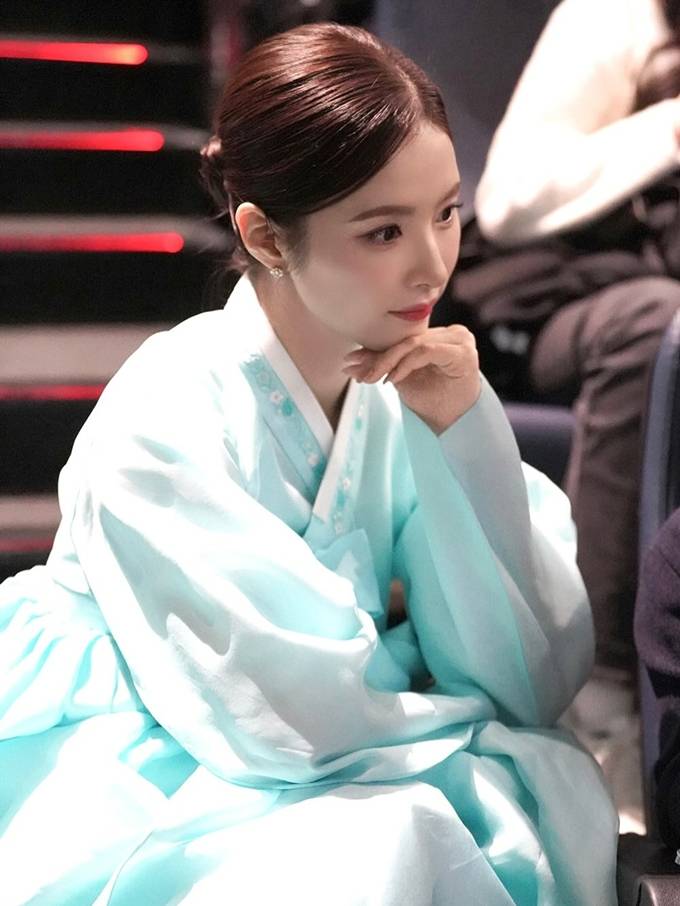 청아한 푸른빛 한복을 완벽하게 소화한 신세경은 단순한 의상을 넘어 하나의 작품 같은 분위기를 연출하며, 전통 패션이 지닌 timeless한 아름다움을 다시 한번 입증했다.