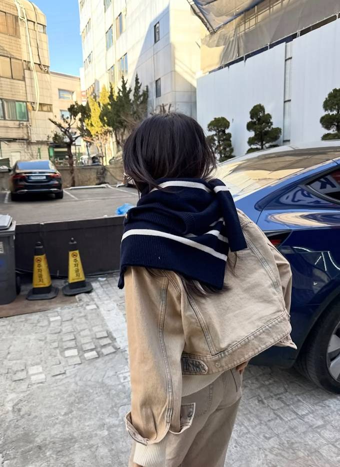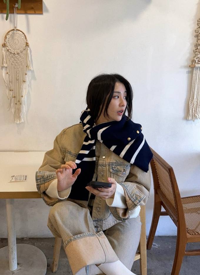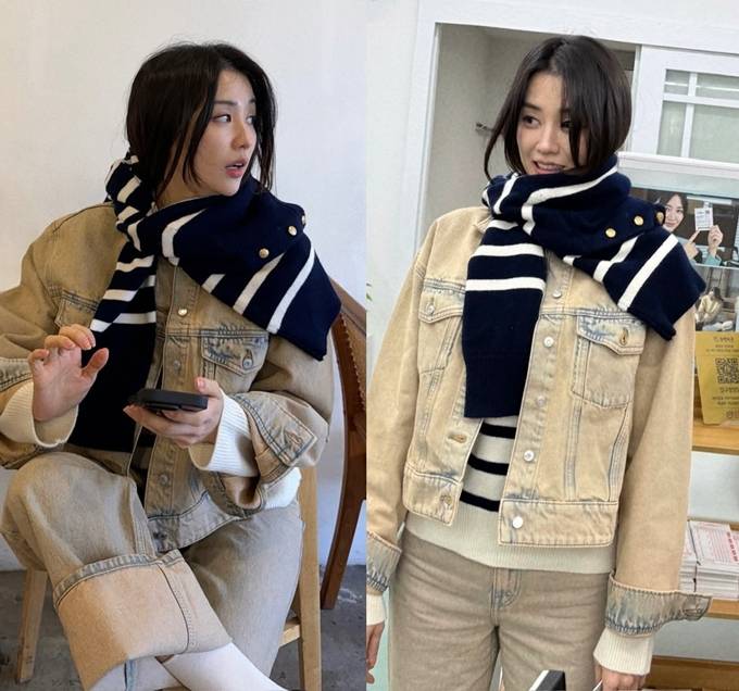 여기에 네이비 컬러의 스트라이프 머플러로 전체 분위기를 살리는 스타일링 키 아이템으로 활용했다.