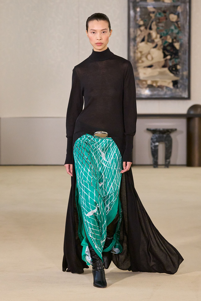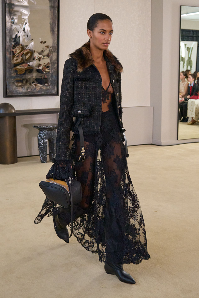 전통적인 리듬을 현대적으로 재해석한 니트 랩 스커트, 프린지 장식 트위드 스커트는 루이스 부뉴엘의 영화 <부르주아의 은밀한 매력>에서 느껴지는 반항적인 우아함을 떠올리게 하고, 익숙한 형태에 해체적인 실루엣과 파격적인 변화를 시도했다.