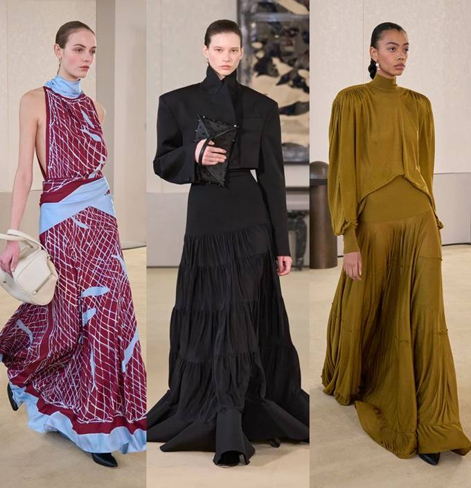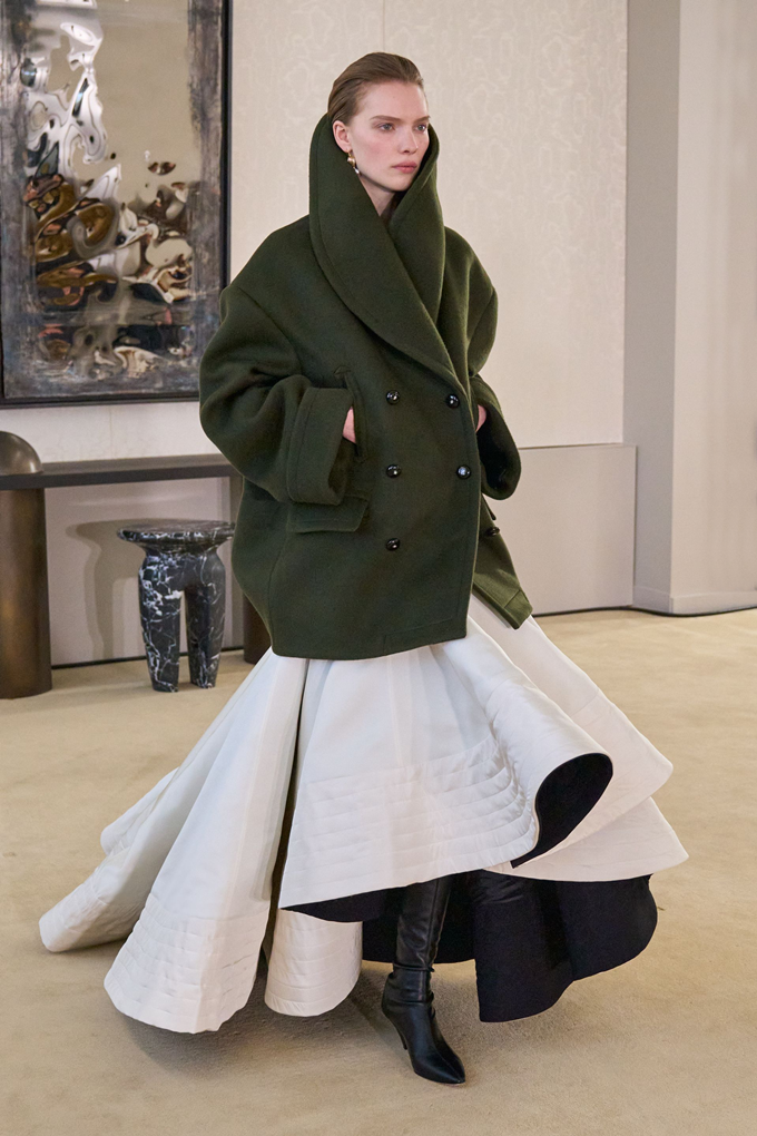 전통 플라멩코 스커트의 아름다운 곡선을 연상시키는 티어드 스커트는 볼륨감과 구조감을 주입, 코쿤 형태의 피코트와 극적인 대비를 이루며 컬렉션을 지배했다.