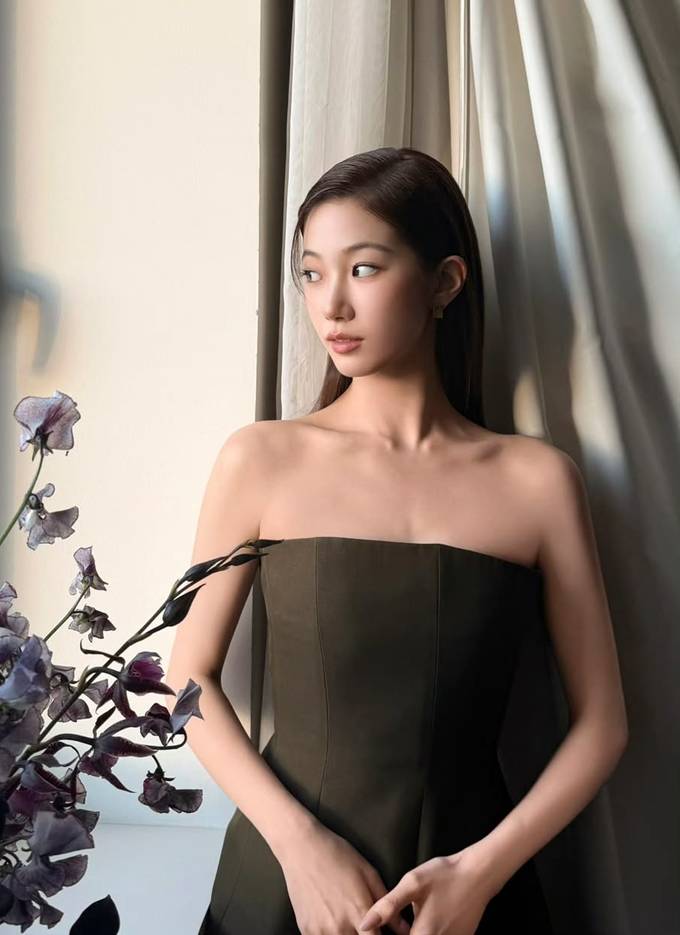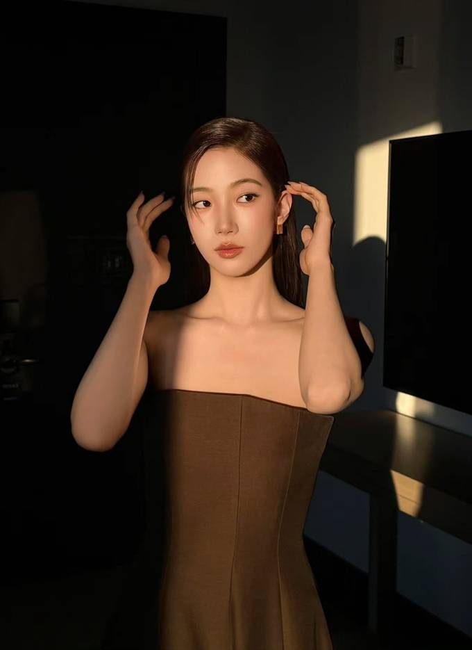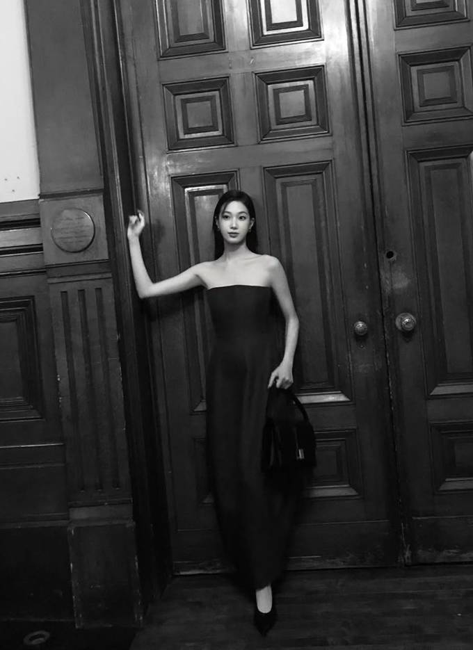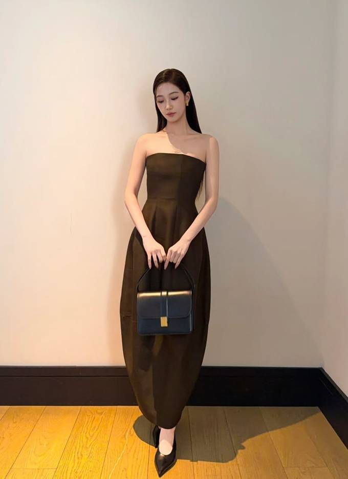 공개한 사진에서 구조적인 라인이 강조된 스트랩리스 브라운 롱 드레스룩으로 미니멀하면서도 우아한 분위기를 자아냈다.