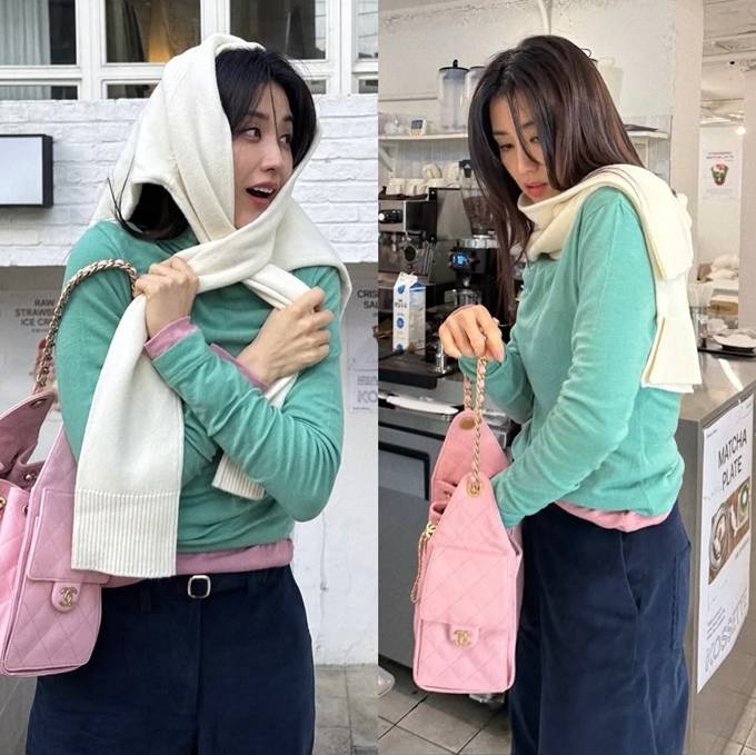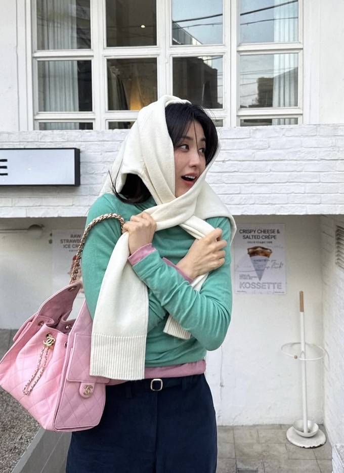 박하선은 핑크 이너에 그린 컬러의 티셔츠를 레이어드하고 화이트 니트 스웨터를 어깨와 머리에 두른 컬러풀한 스타일로 봄 외출 패션을 완성했다.