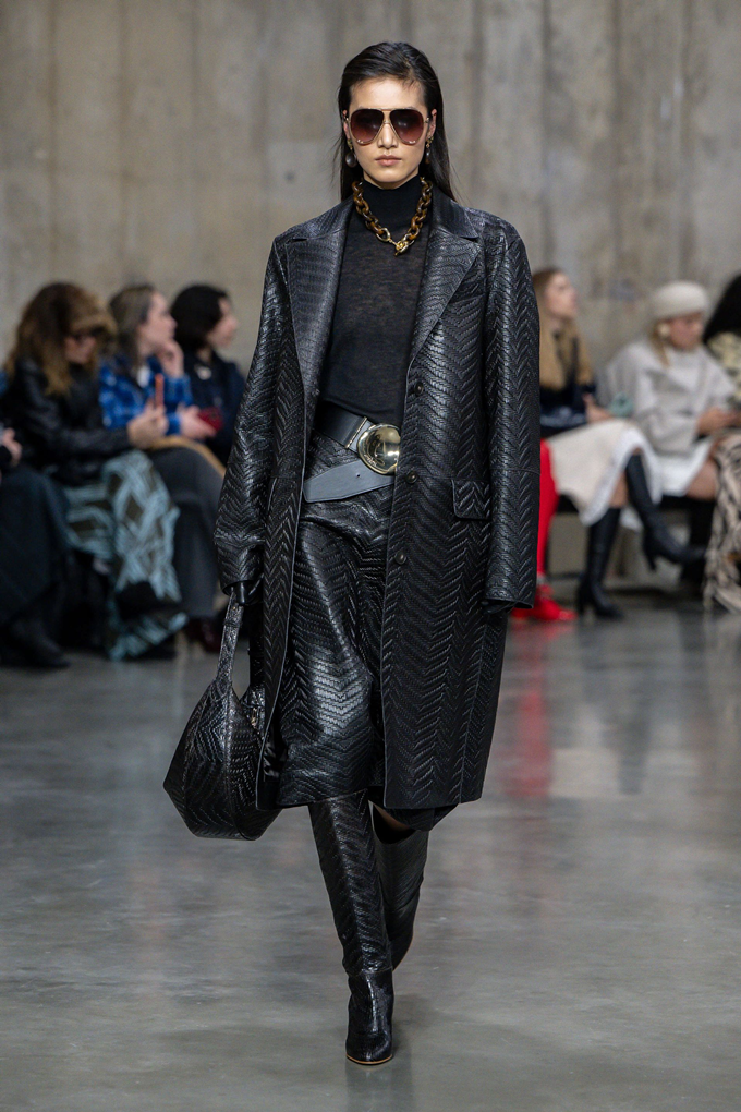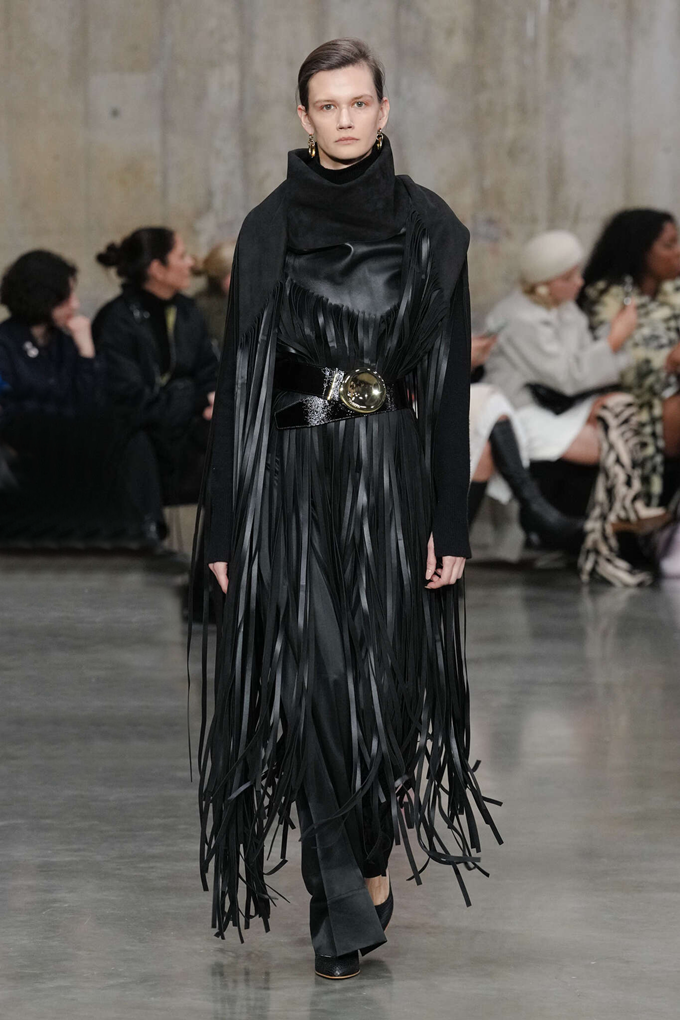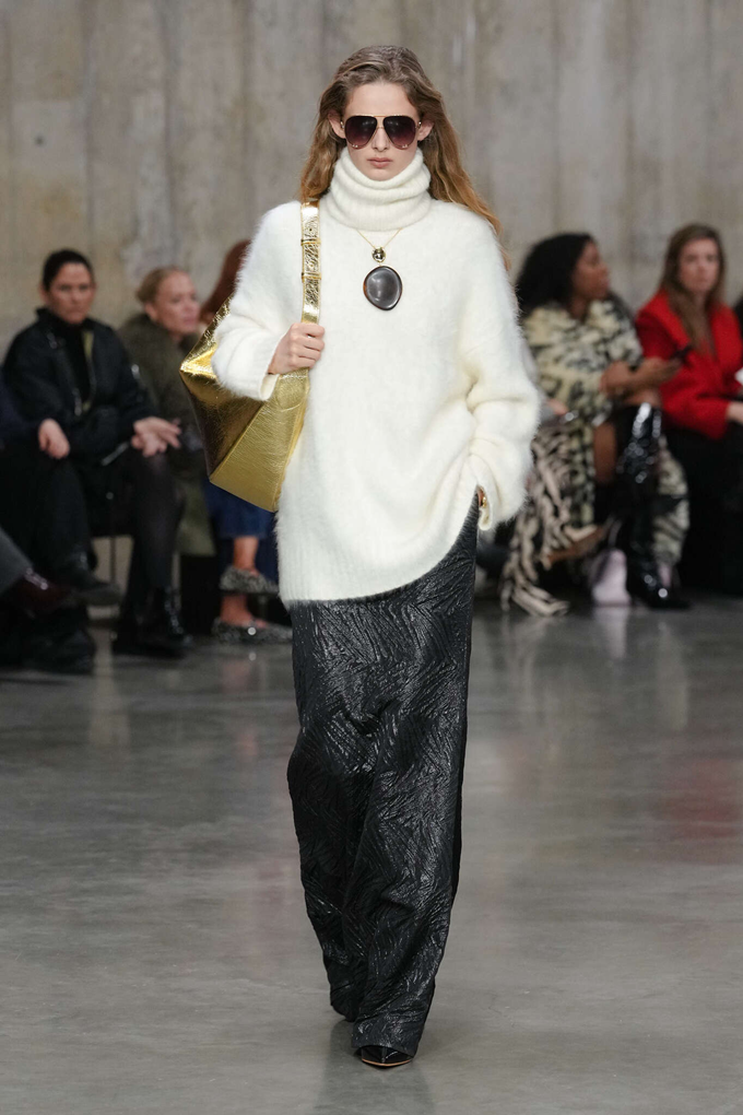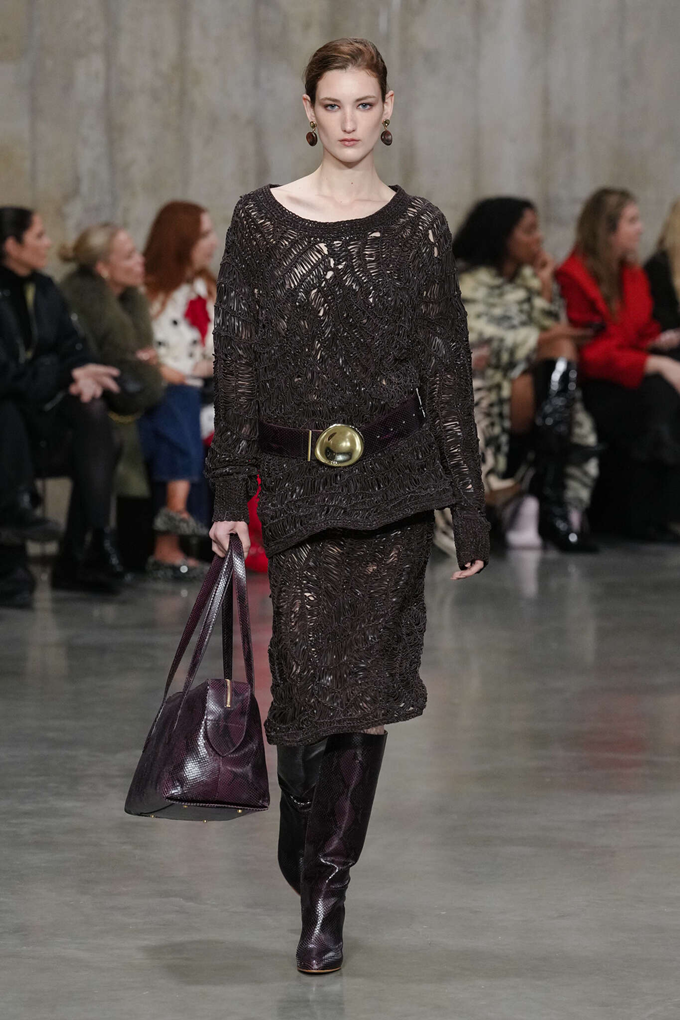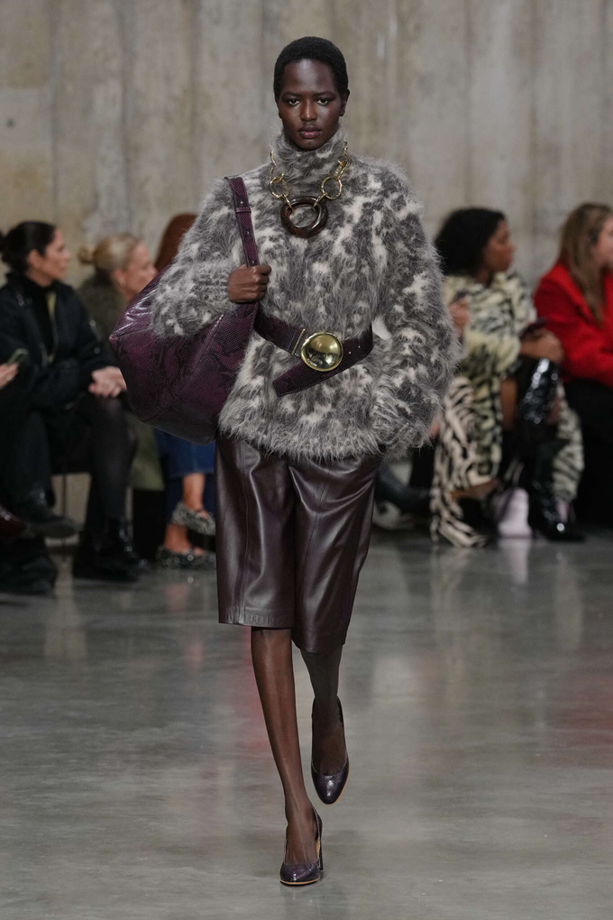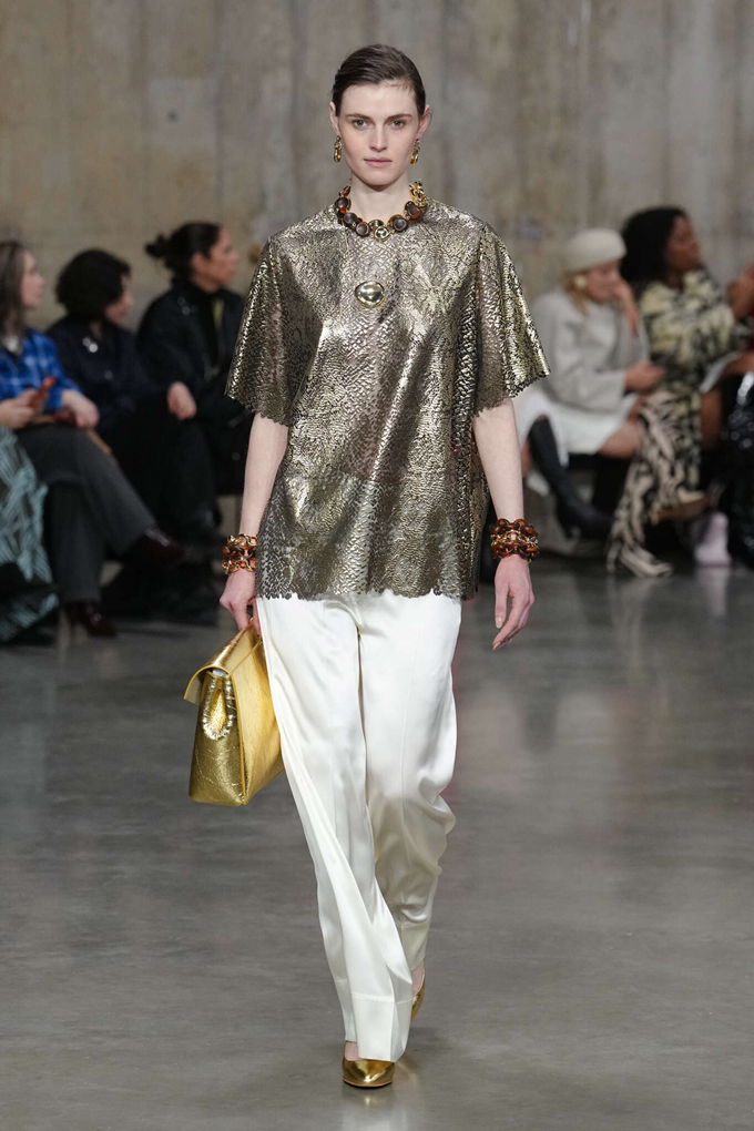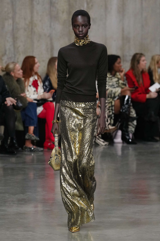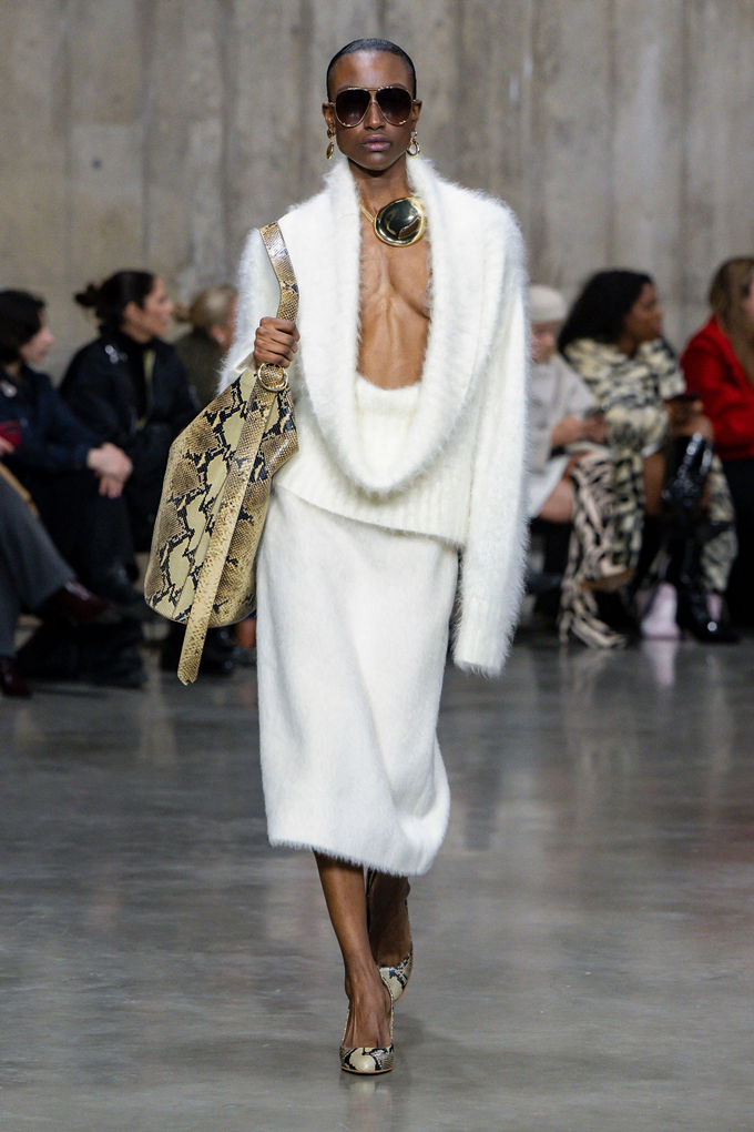 니트와 스커트 정장 앞면의 깃털 장식, 금빛 벨트 버클과 굵직한 팔찌 등 세심한 디테일에 심혈을 기울였고 원단, 모피, 실을 사용하여 열망을 담았다.