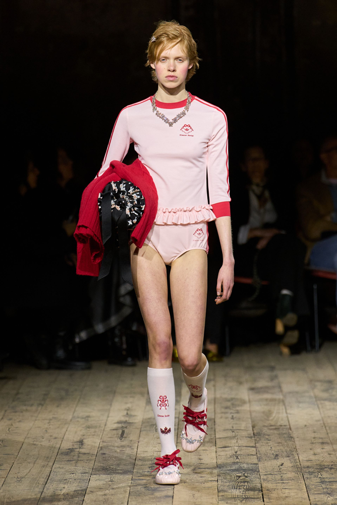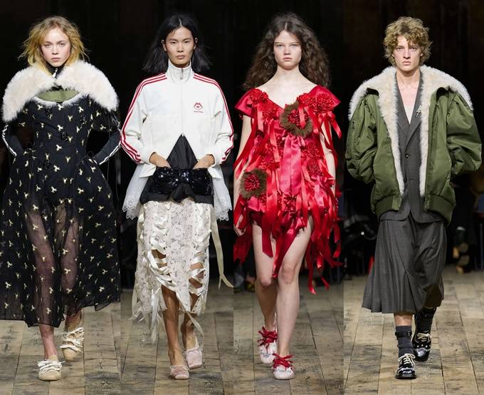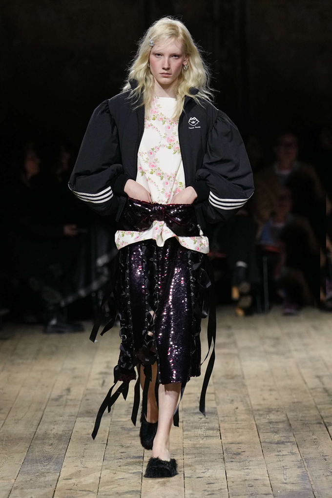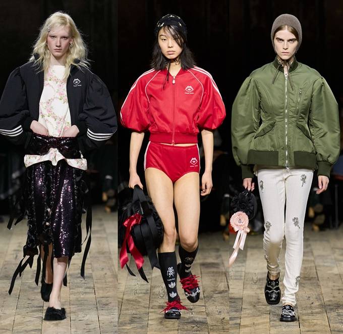 아디다스와 협업으로 탄생한 삼선 트랙 재킷과 바시티 재킷, 핑크 러플 장식을 더한 삼선 티셔츠를 비롯해 아디다스 재킷과 러플 스커트 조합은 스포츠 패션 협업을 새로운 차원으로 끌어올렸다.