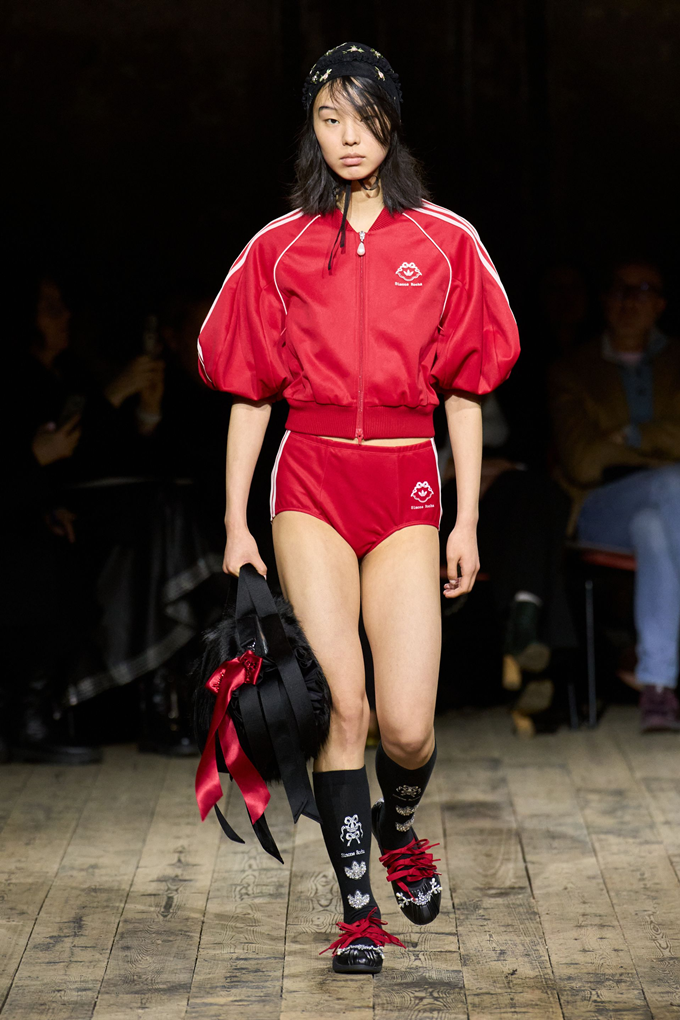 트랙 재킷은 튤 스커트와 어우러지고, 소매는 풍성하게 부풀어 올랐으며 트레이닝 쇼츠는 마이크로 실크 핫팬츠로 변신하며 강인함과 소녀다운 우아함 사이의 정교한 조화를 보여주었다.