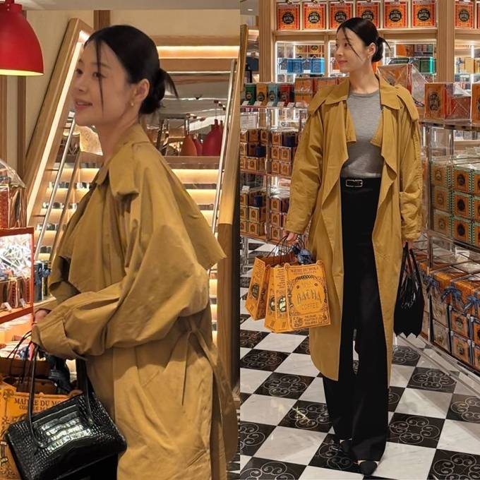 한지혜, 루즈 핏 트렌치 하나 걸쳤을 뿐인데! 옷 태나는 예쁜 엄마의 간절기 외출룩