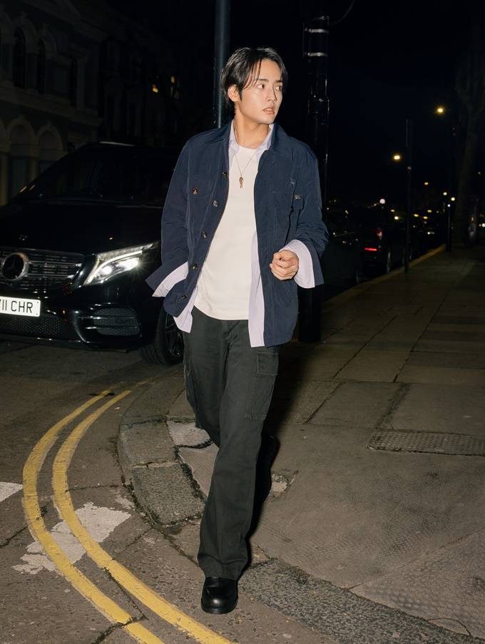 런던 현지에서 포착된 승민은 빈티지한 무드의 데님 해링턴 재킷에 스트라이프 울 캐시미어 티셔츠와 블랙 코듀로이 팬츠를 매치해, 자유로우면서도 세련된 런던의 오프-듀티 스타일을 완벽하게 재현했다.