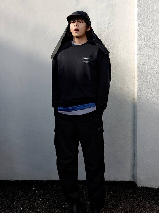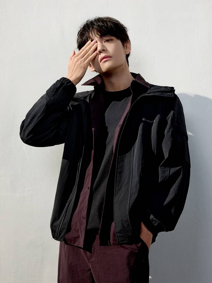 뷔는 아웃도어 브랜드 스노우피크 어패럴과 함께한 2026년 봄 컬렉션 화보에서 아웃도어 웨어가 일상 속 장면으로 자연스럽게 스며드는 순간을 담아냈다.