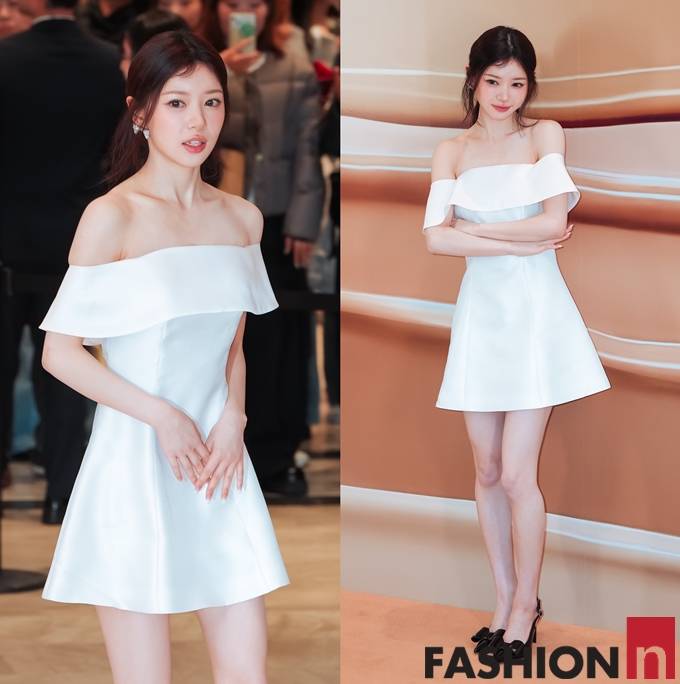 이날 행사에서 모카는 가녀린 몸매가 돋보이는 화이트 미니 오프숄더 드레스룩으로 청순하면서도 귀여운 미모를 드러냈다.