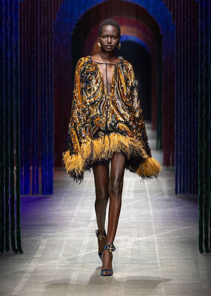 타탄 체크와 트롱프뢰유(trompe-l’oeil) 기법을 사용한 스카프 프린트의 대비, 중세 동물 문양에서 연상시키는 모티프와 문장 디테일, 페이즐리 패턴, 예상치 못한 깃털 장식이 더해진 슬림한 테일러링이 조화를 이룬다.