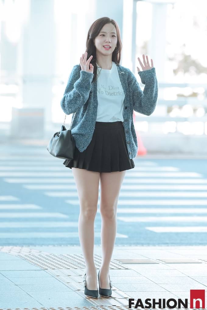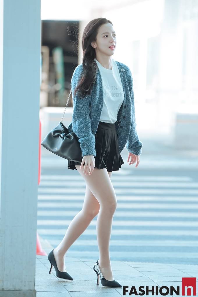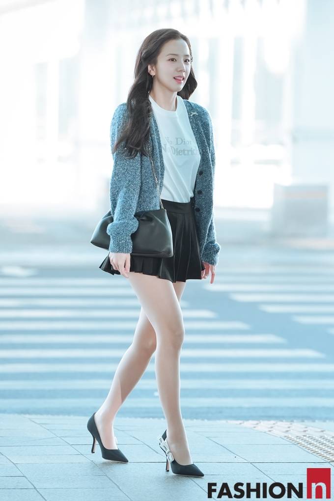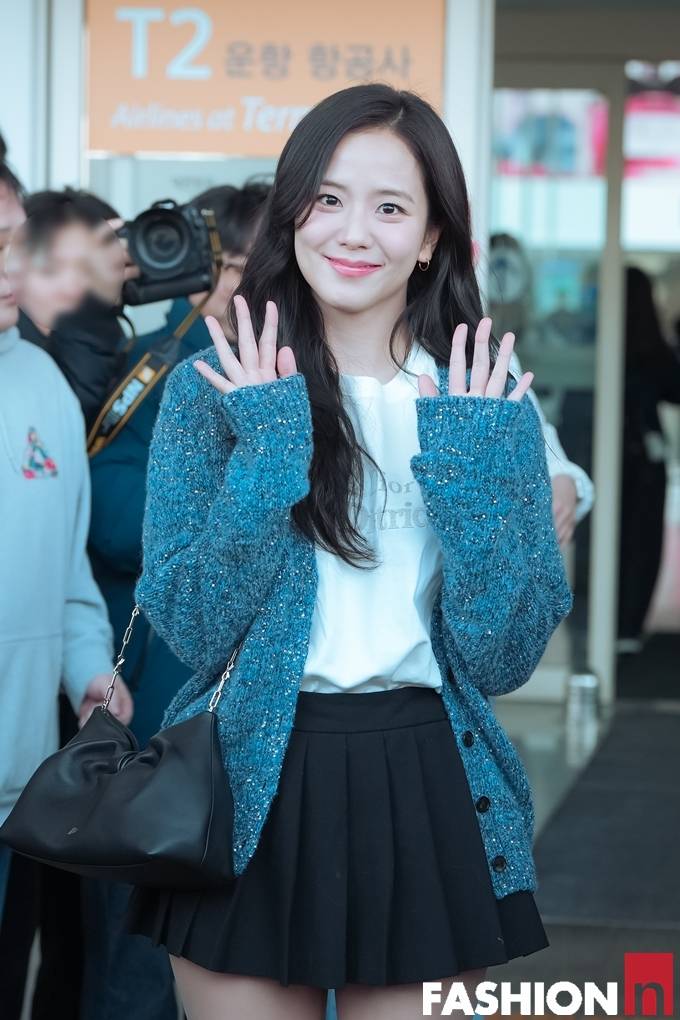 이날 지수는 짧은 미니 플리츠 스커트에 화이트 티셔츠와 블루 트위드 카디건을 걸친 출국 스타일로 청순하면서도 발랄한 공항 프레피룩을 선보였다.