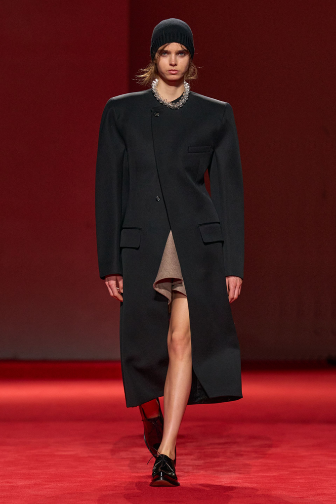 하우스의 핵심인 인트레치아토와 가죽공예를 과시하지 않고 옷의 구조와 실루엣을 기본으로 공예적 깊이를 강조한 현대적이고 실용적인 테일러링으로 재창조했다.