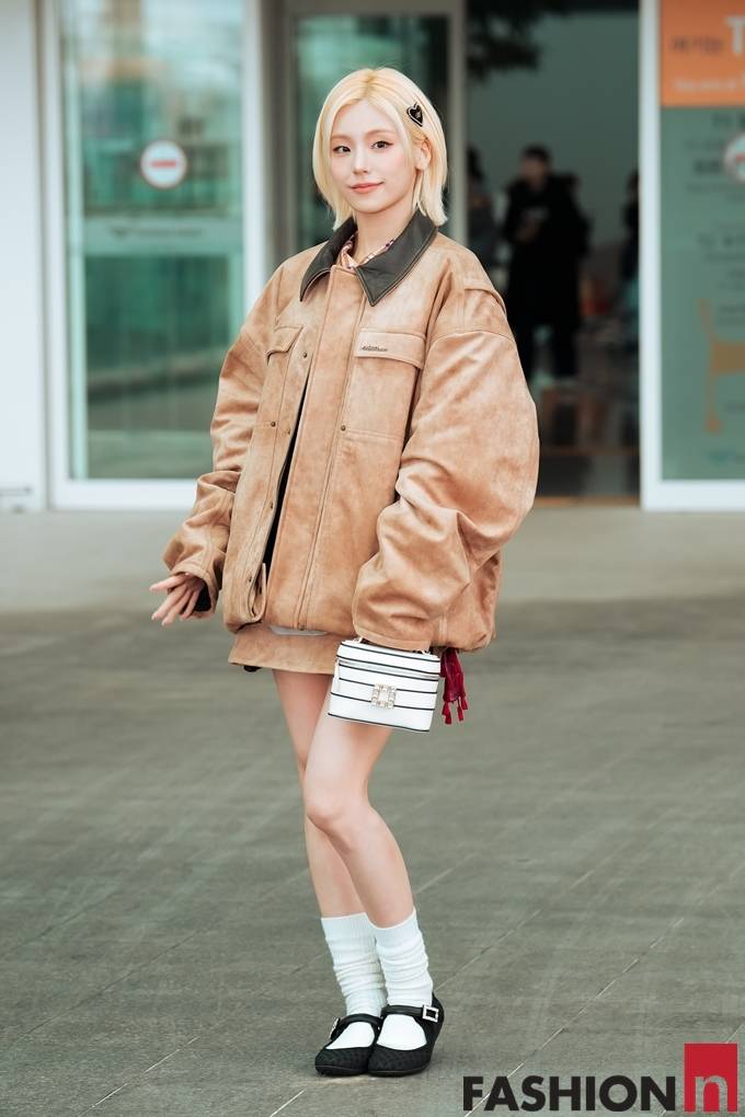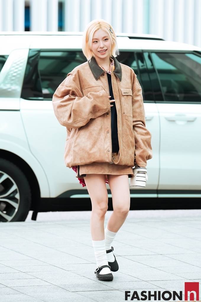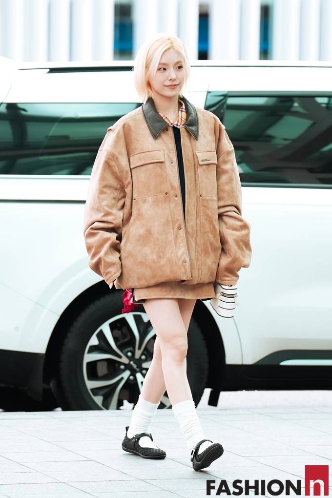 그룹 있지(ITZY)의 예지가 오버핏 레더 재킷의 박시한 출국룩으로 골드빛 요정미를 발산했다.