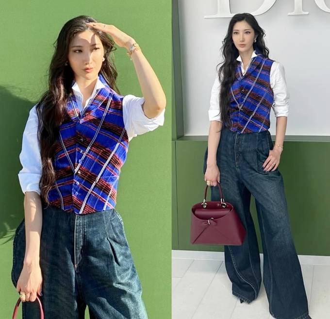 하의로는 볼륨감 있는 와이드 데님 팬츠를 선택해 트렌디함을 더했다. 하이웨이스트 디자인과 여유 있는 실루엣이 상체의 단정한 레이어드와 대비를 이루며 세련된 균형을 완성했다.