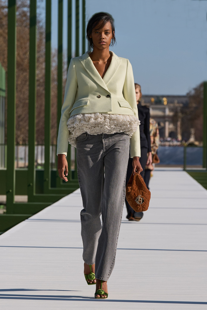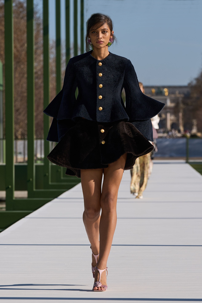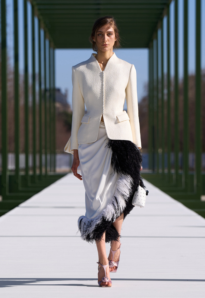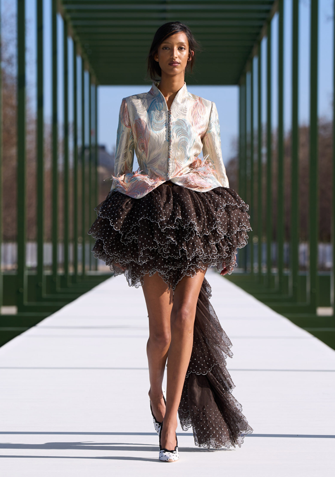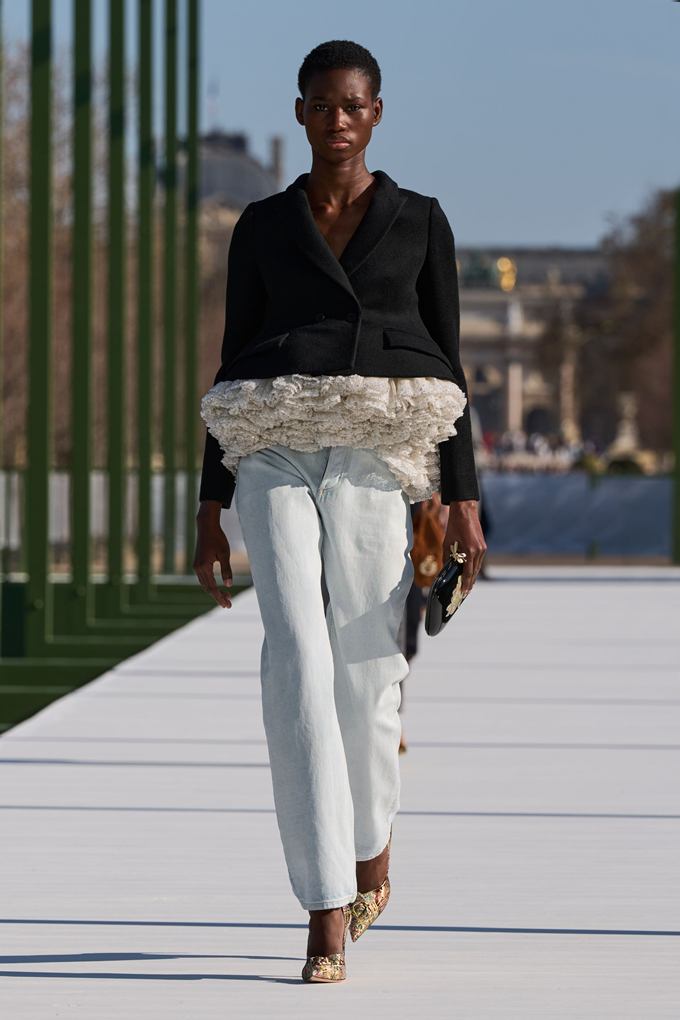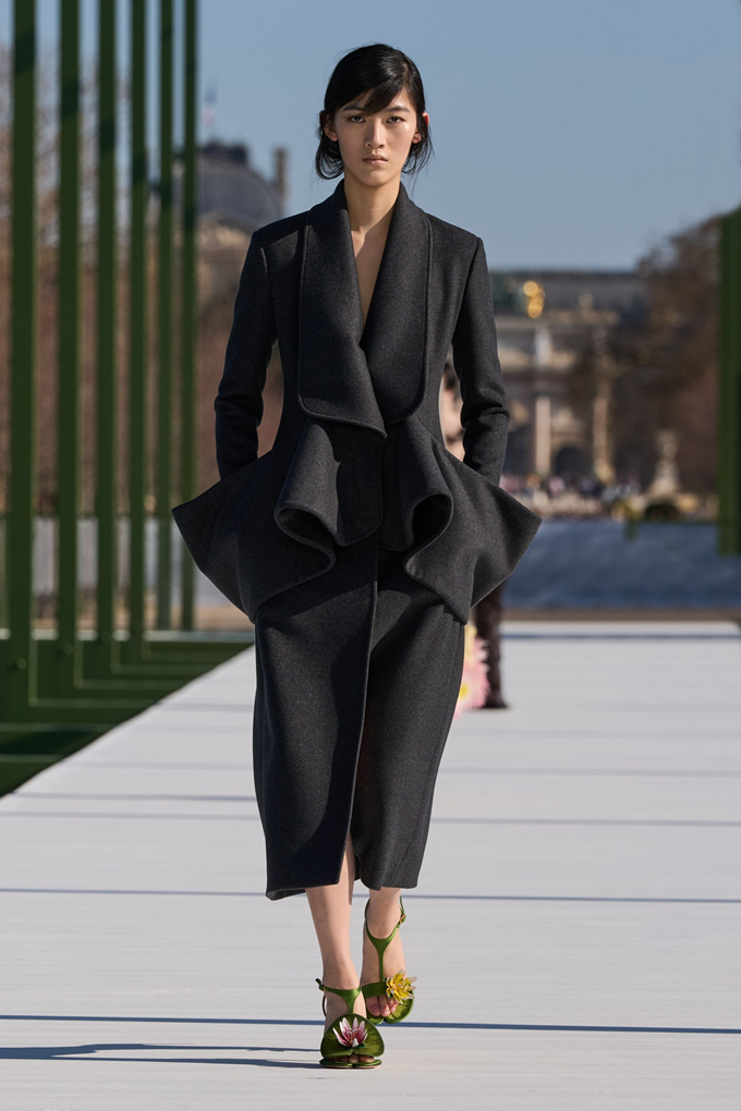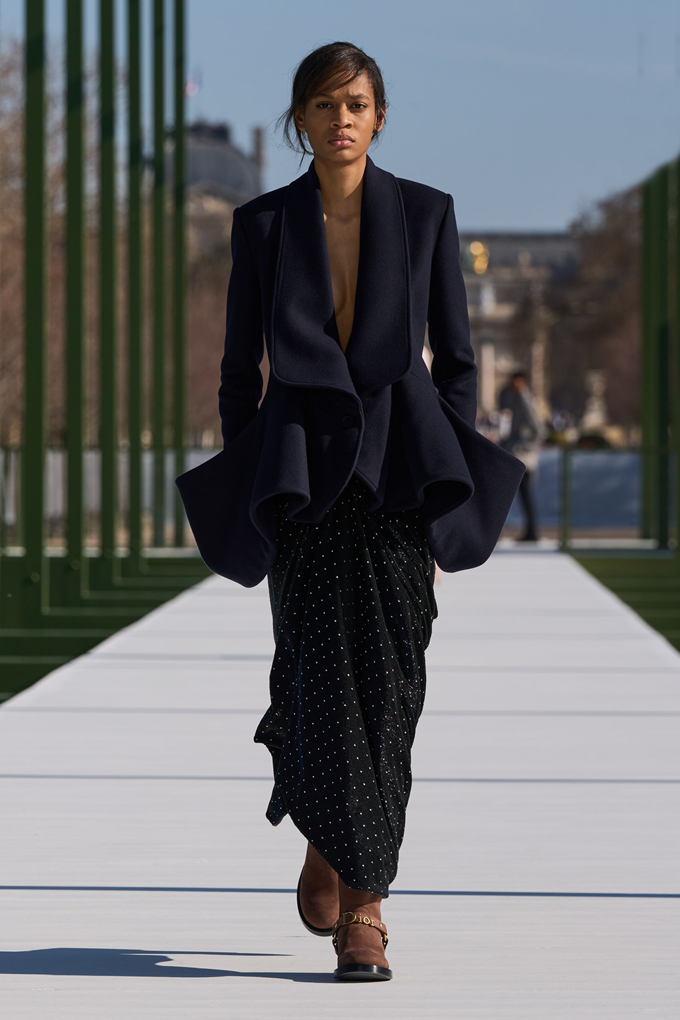 페플럼 장식의 바 재킷은 프릴과 러플 장식의 볼륨 스커트와 짝을 이루며 컬렉션 전반에 걸쳐 반복적으로 등장했다.