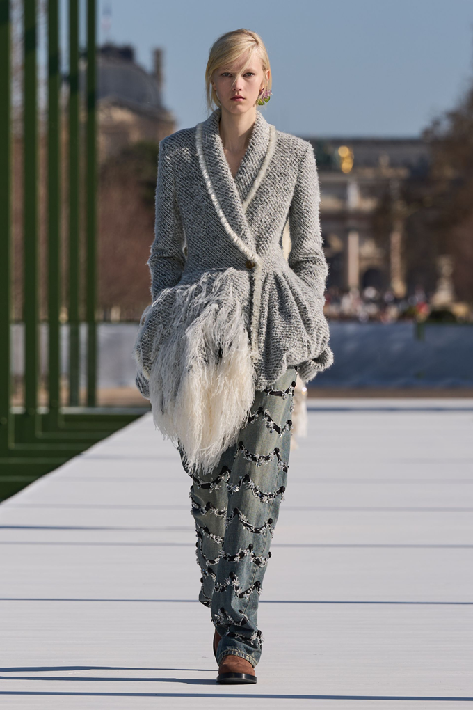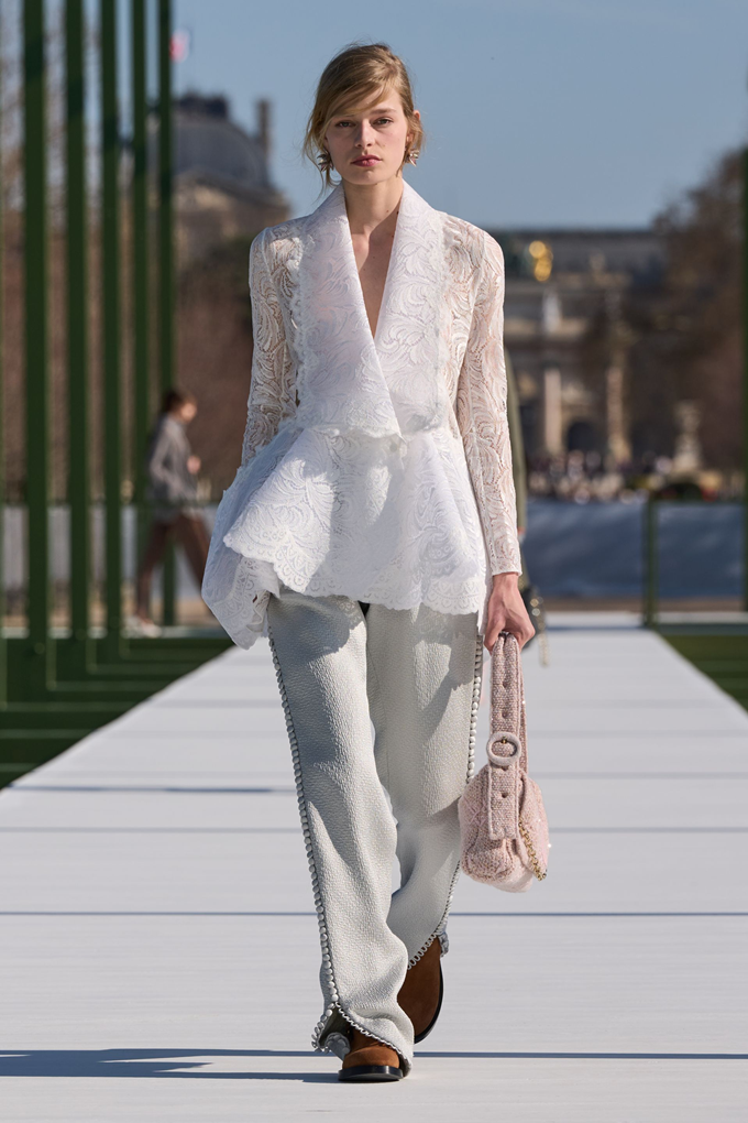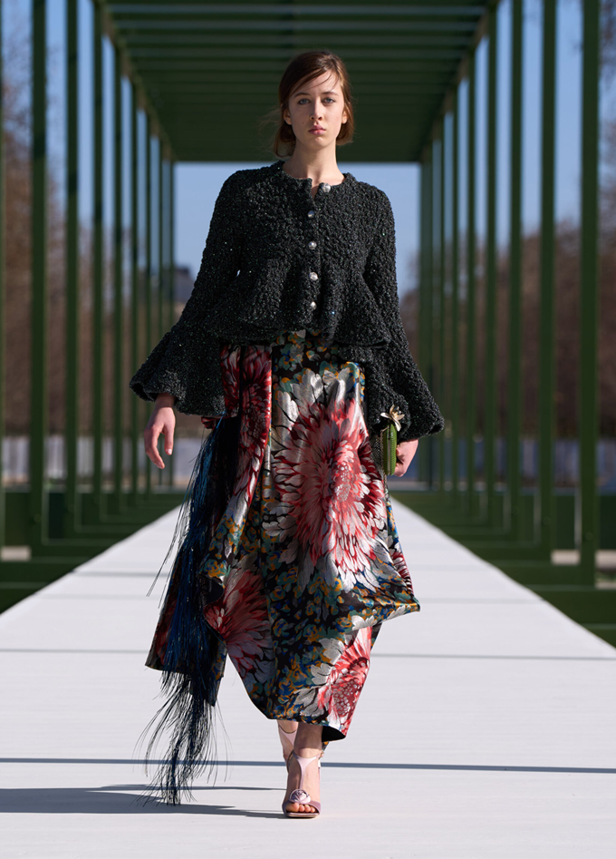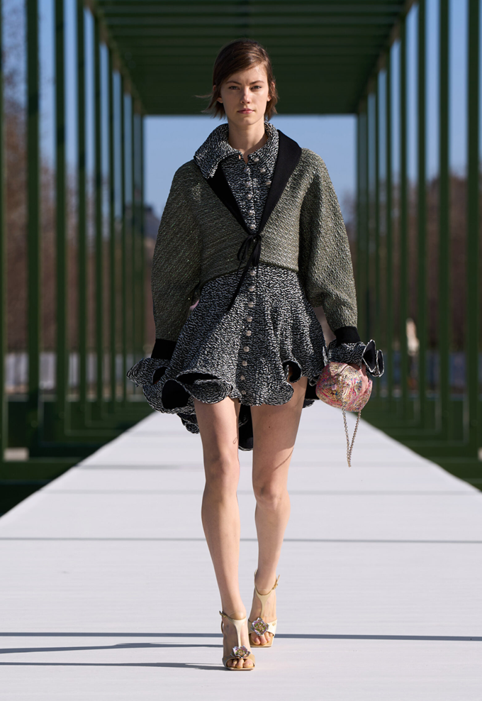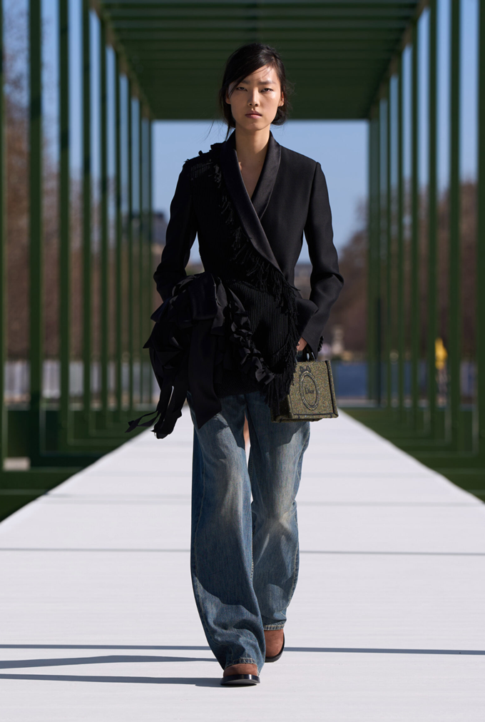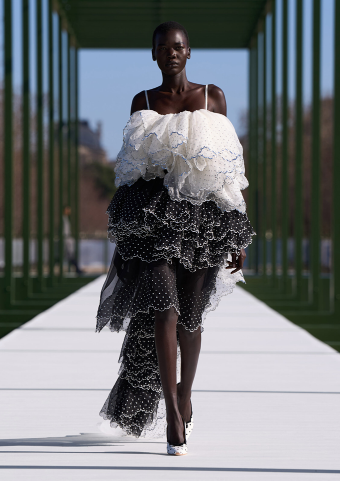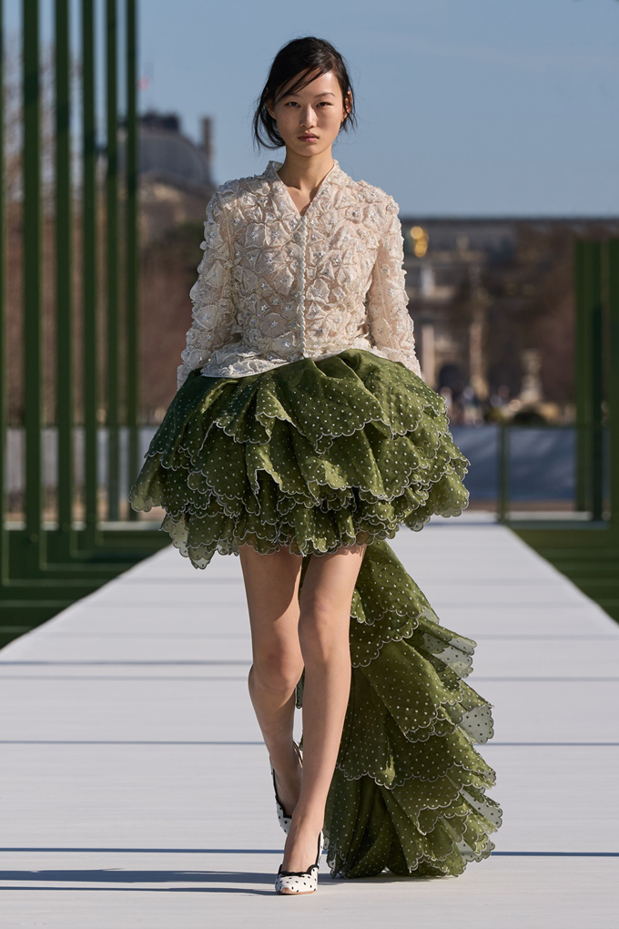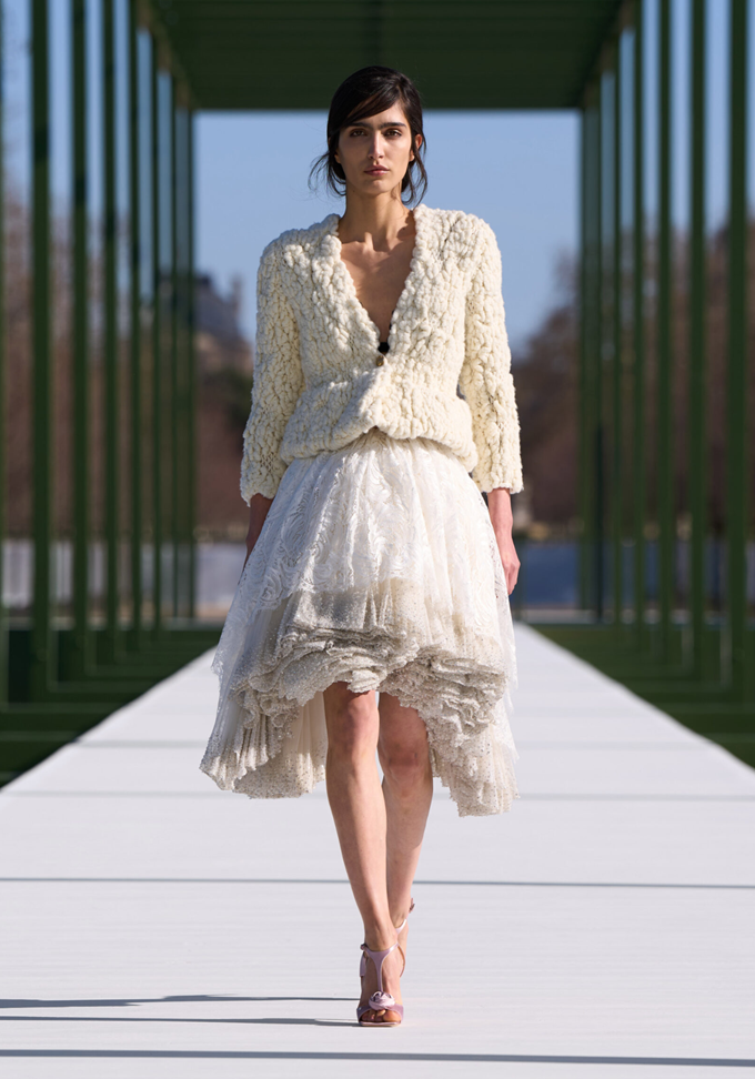 페플럼 장식의 바 재킷은 프릴과 러플 장식의 볼륨 스커트와 짝을 이루며 컬렉션 전반에 걸쳐 반복적으로 등장했다.