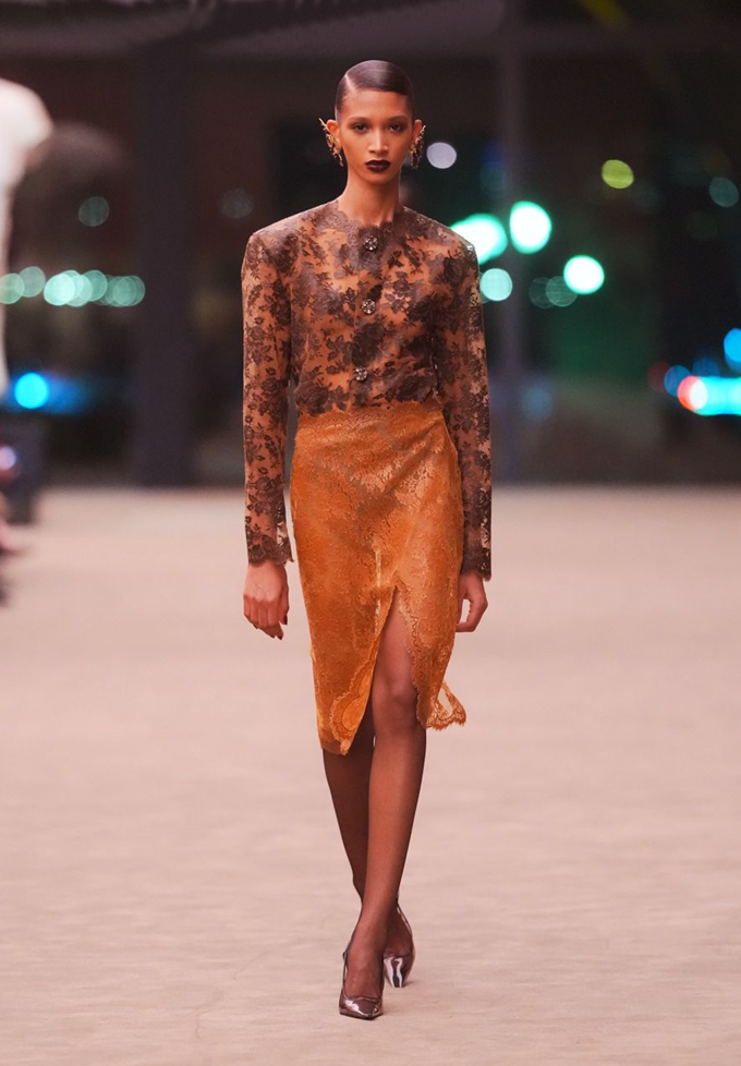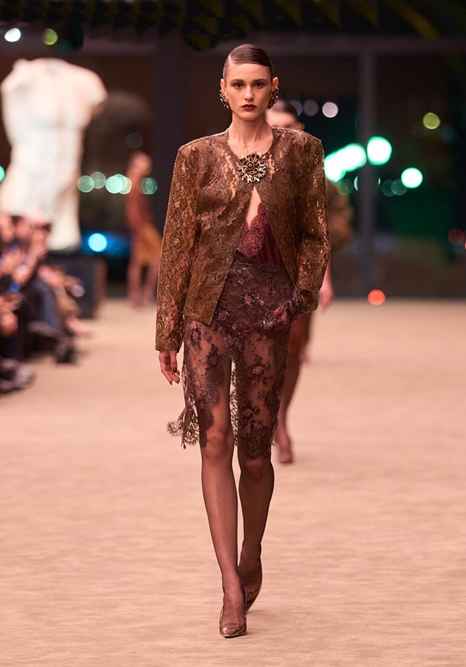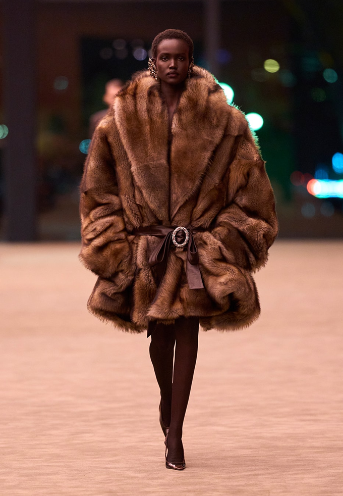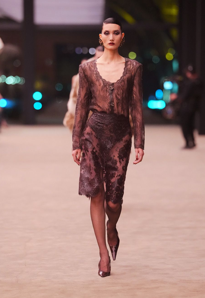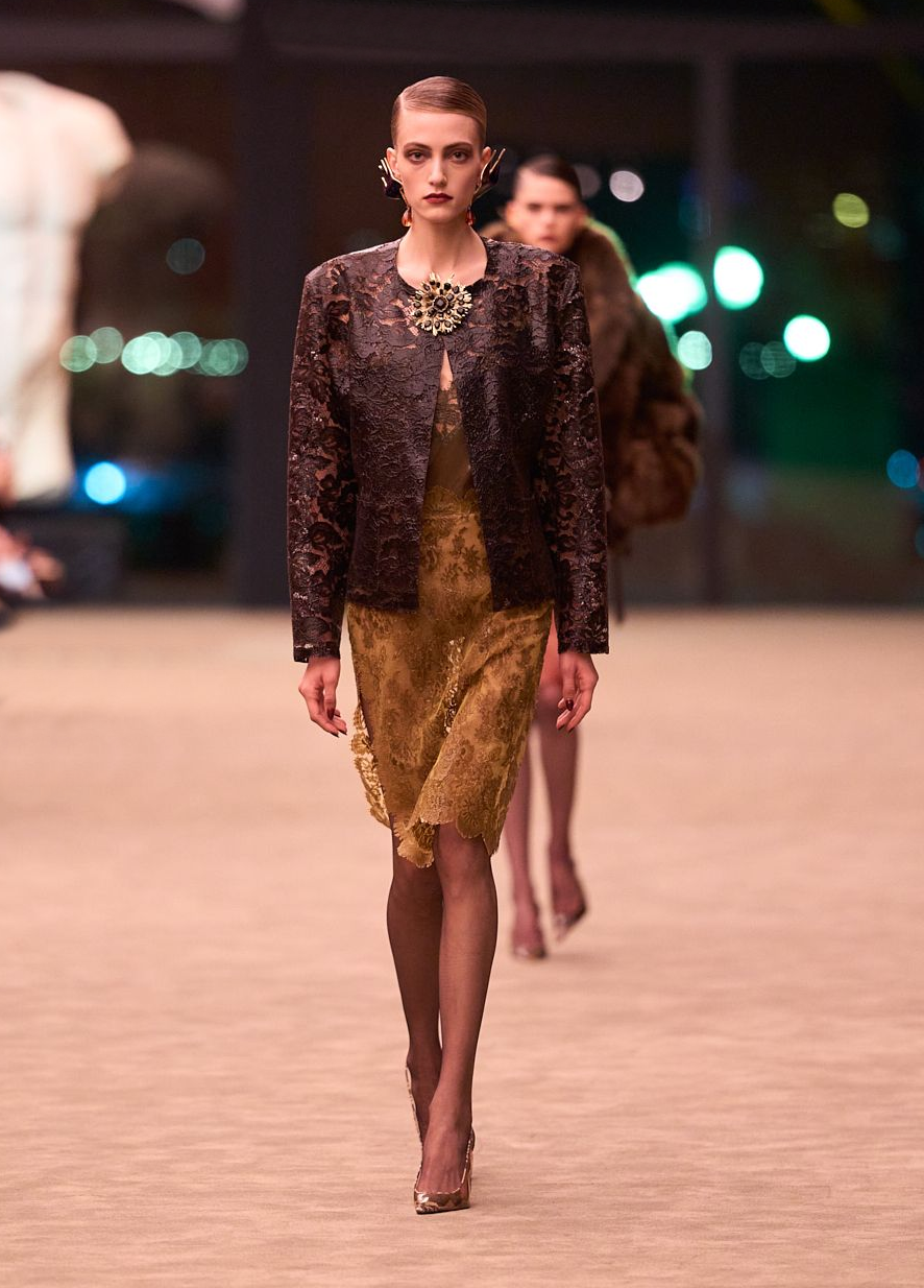 붉은색, 오렌지색, 갈색 등 흙빛 계열의 시스루 레이스 드레스와 스커트는 커다란 모피 코트와 매치되거나 굵직한 액세서리로 균형을 맞췄다.