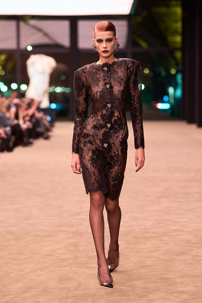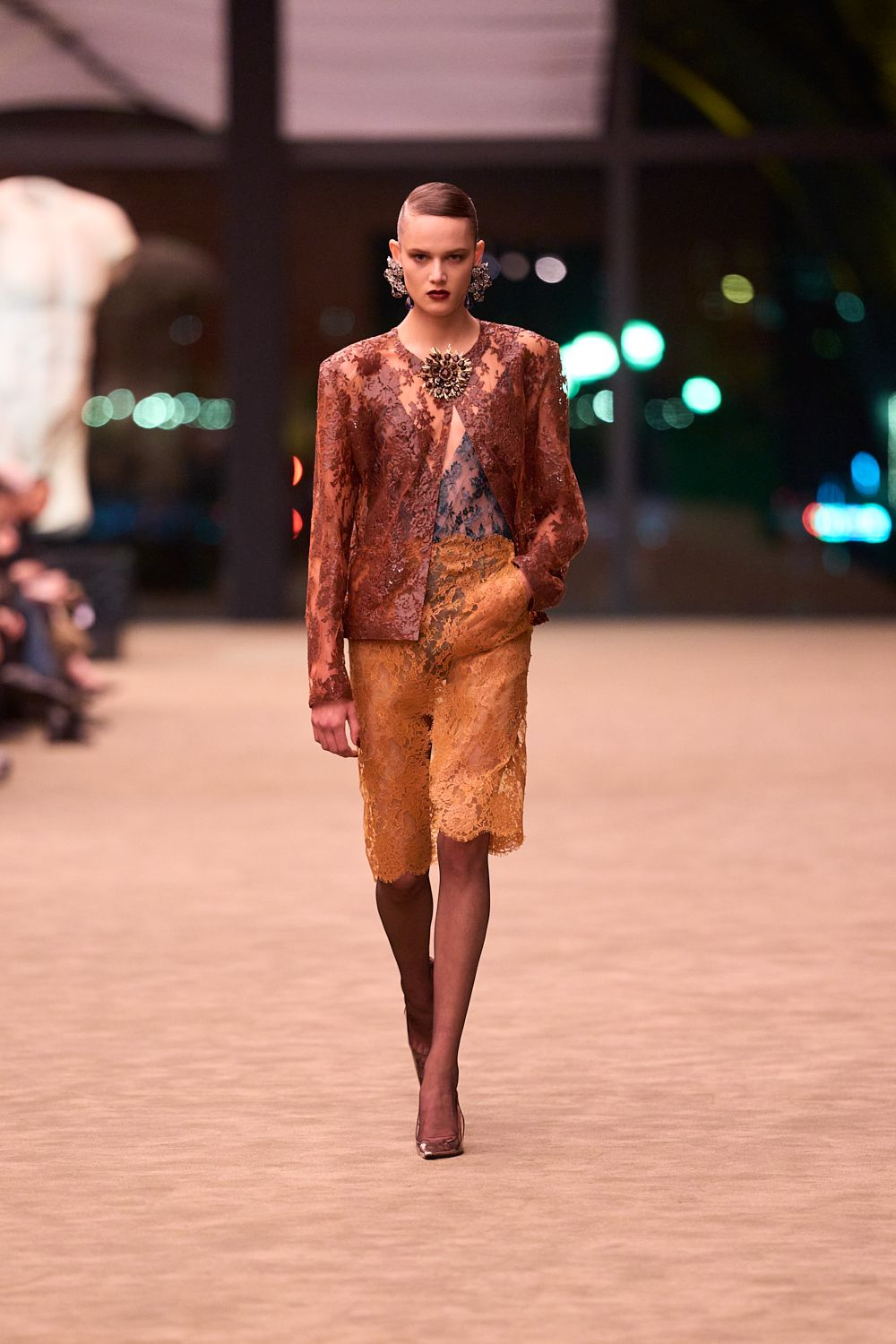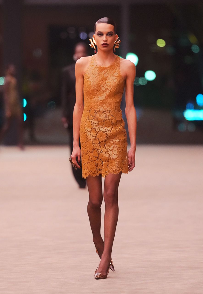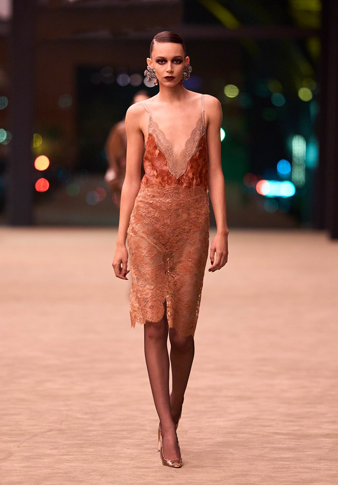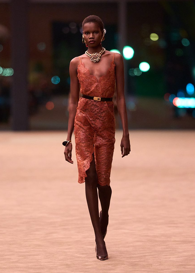 붉은색, 오렌지색, 갈색 등 흙빛 계열의 시스루 레이스 드레스와 스커트는 커다란 모피 코트와 매치되거나 굵직한 액세서리로 균형을 맞췄다.