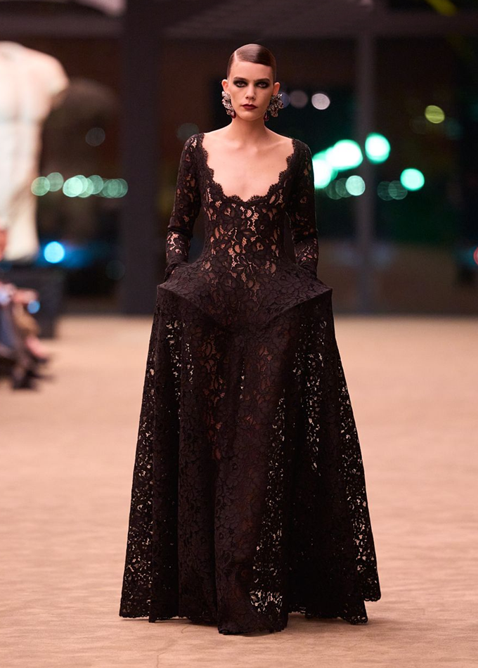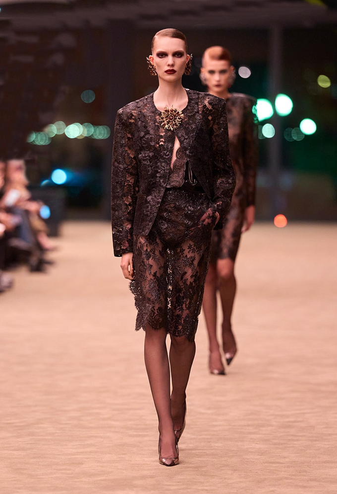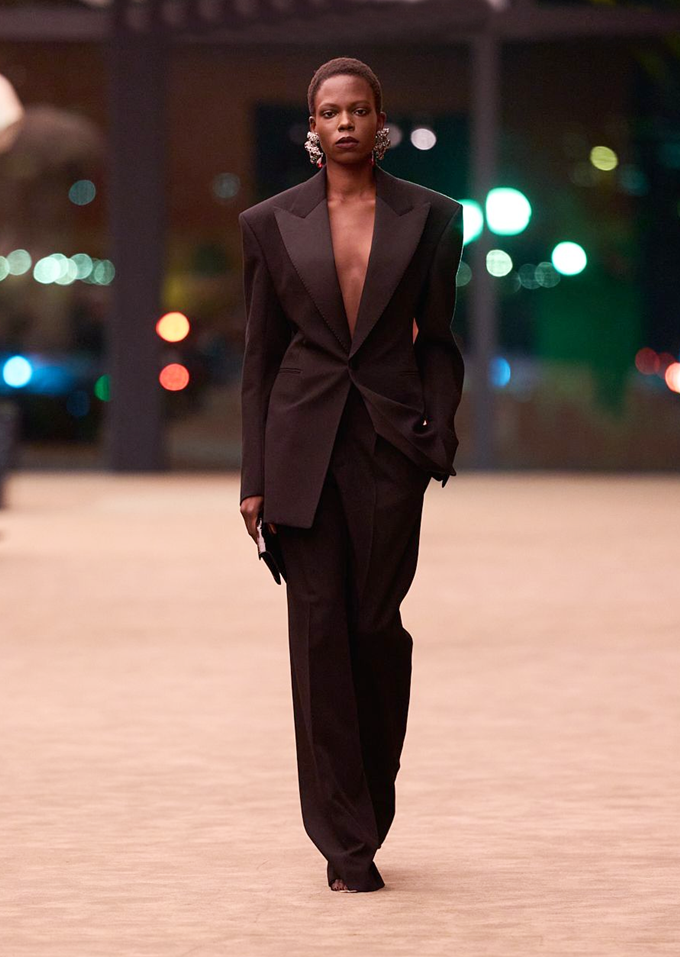 안소니 버카렐로는 이번 컬렉션에 이브 생 로랑이 1966년 데뷔 당시 여성복의 개념을 재정립한 블랙 턱시도 '르 스모킹'의 60주년을 기념했다.