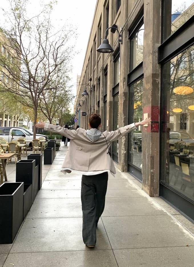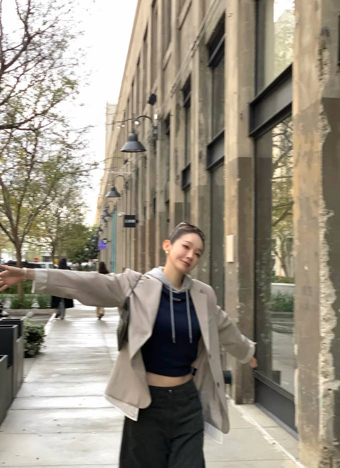 공개한 사진에서 강민경은 베이지 컬러 재킷에 후드 티셔츠와 와이드 팬츠를 매치해 편안하면서도 세련된 스트리트 룩을 완성했다.